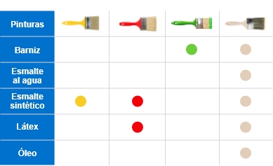 El tipo de pintura determina las cerdas o filamentos de la brocha. Para pinturas al agua puede usarse una brocha con pelo de poliéster; para esmaltes, te recomendamos elegir brochas que tengan pelo natural; y para barnices e impermeabilizantes lo ideal son las fibras naturales.