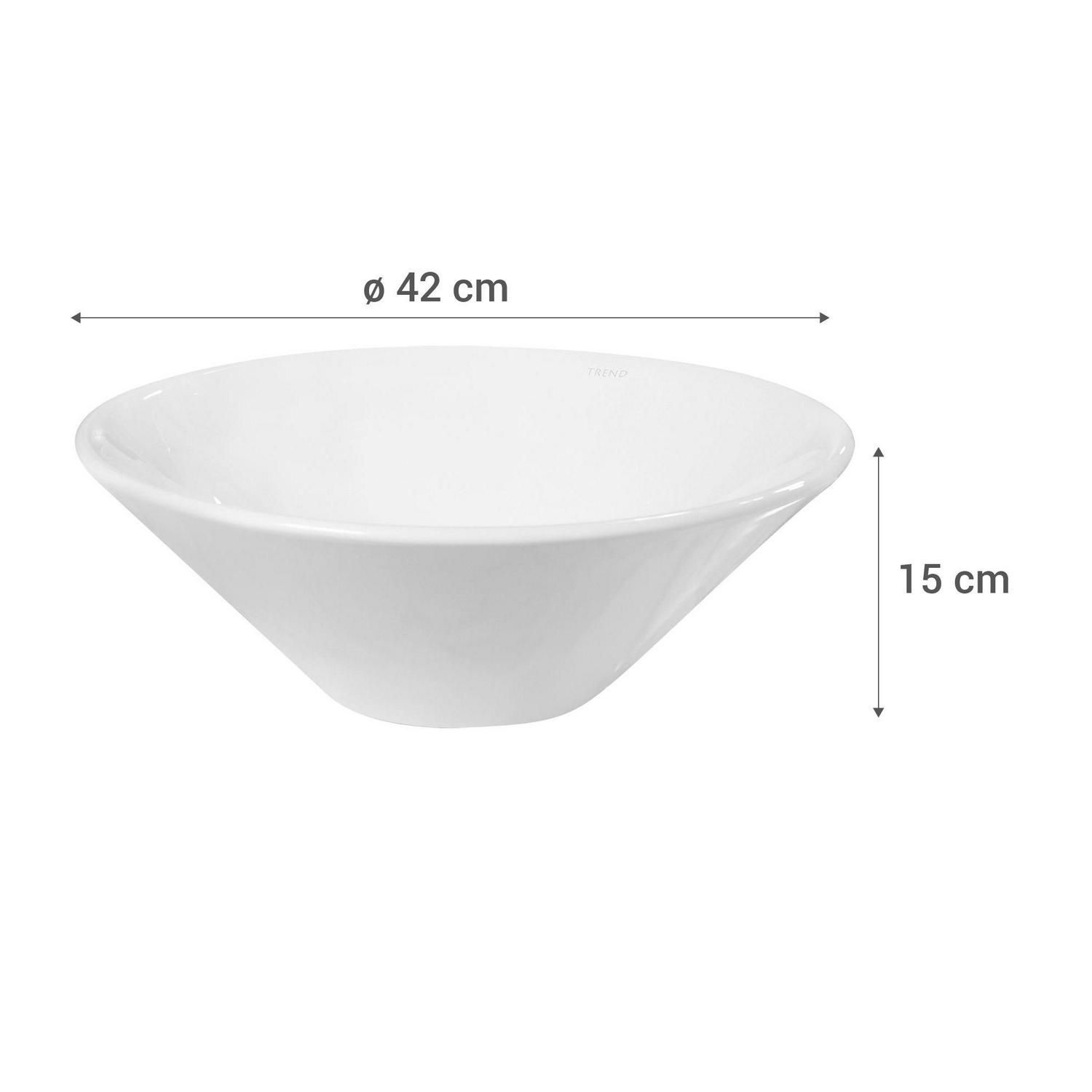 El Lavamanos p/vanitorio Trend, con instalacin sobremesa, tiene un ancho de 43 cm y una profundidad de 42 cm, ofreciendo amplitud y comodidad. Su superficie lisa y pulida es agradable al tacto y fcil de limpiar. Adems, su diseo con forma redonda y borde redondeado garantiza seguridad para toda la familia. Su capacidad volumtrica es de 3.6 l.