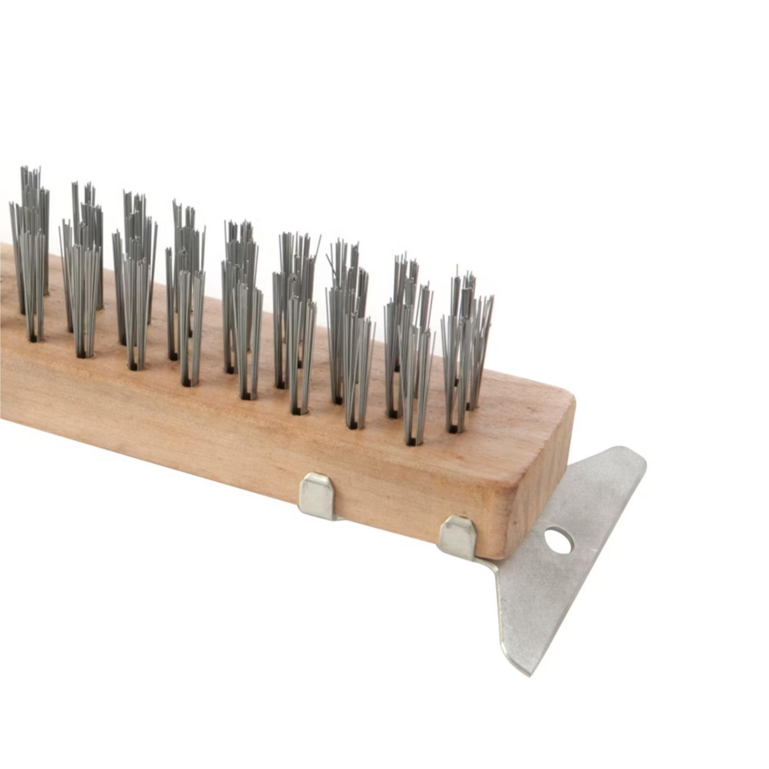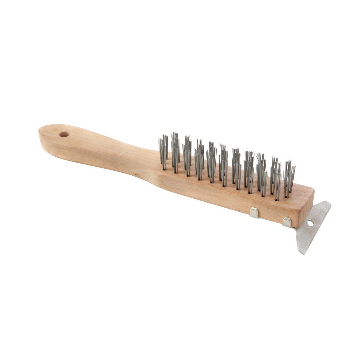 | Característica | Cepillo de alambre con mango de madera y raspadro. Ideal para limpieza y preparación de superficies |
