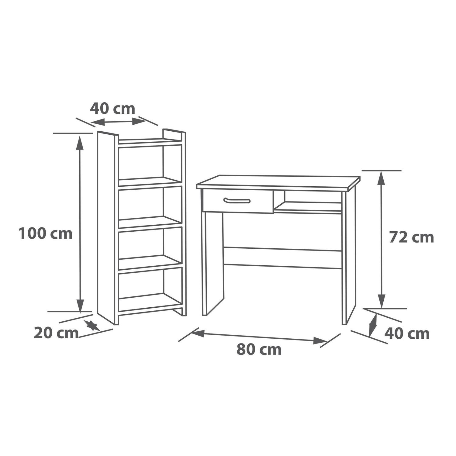 | Características | Escritorio de 80x40x72 cm. Estante de 40x20x100 cm |