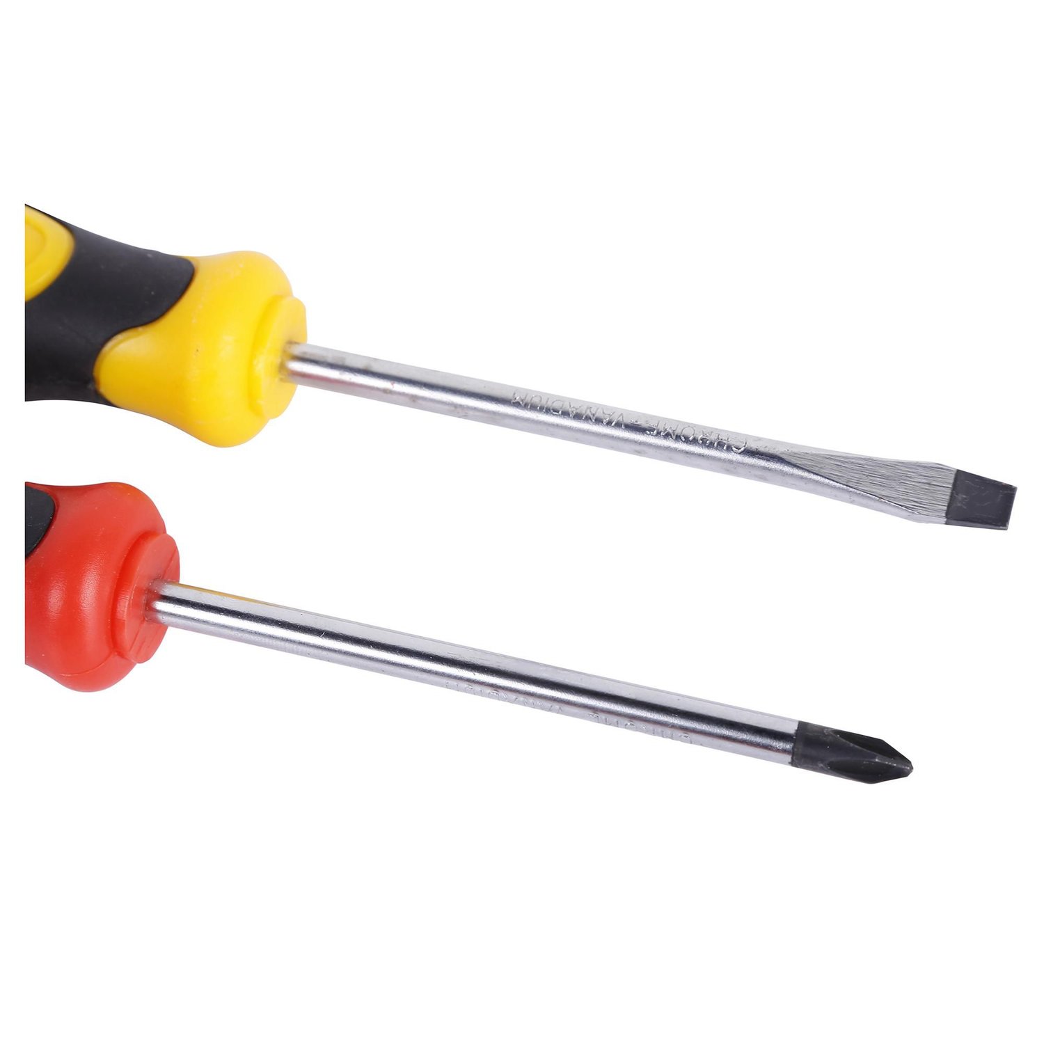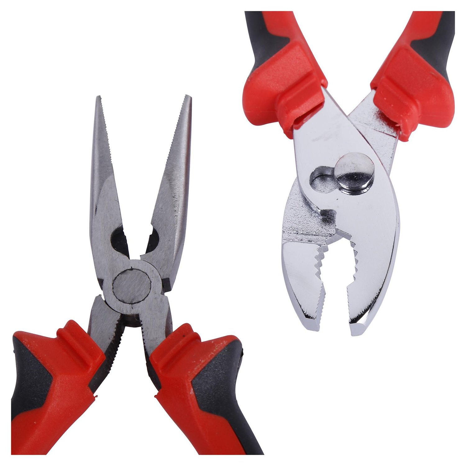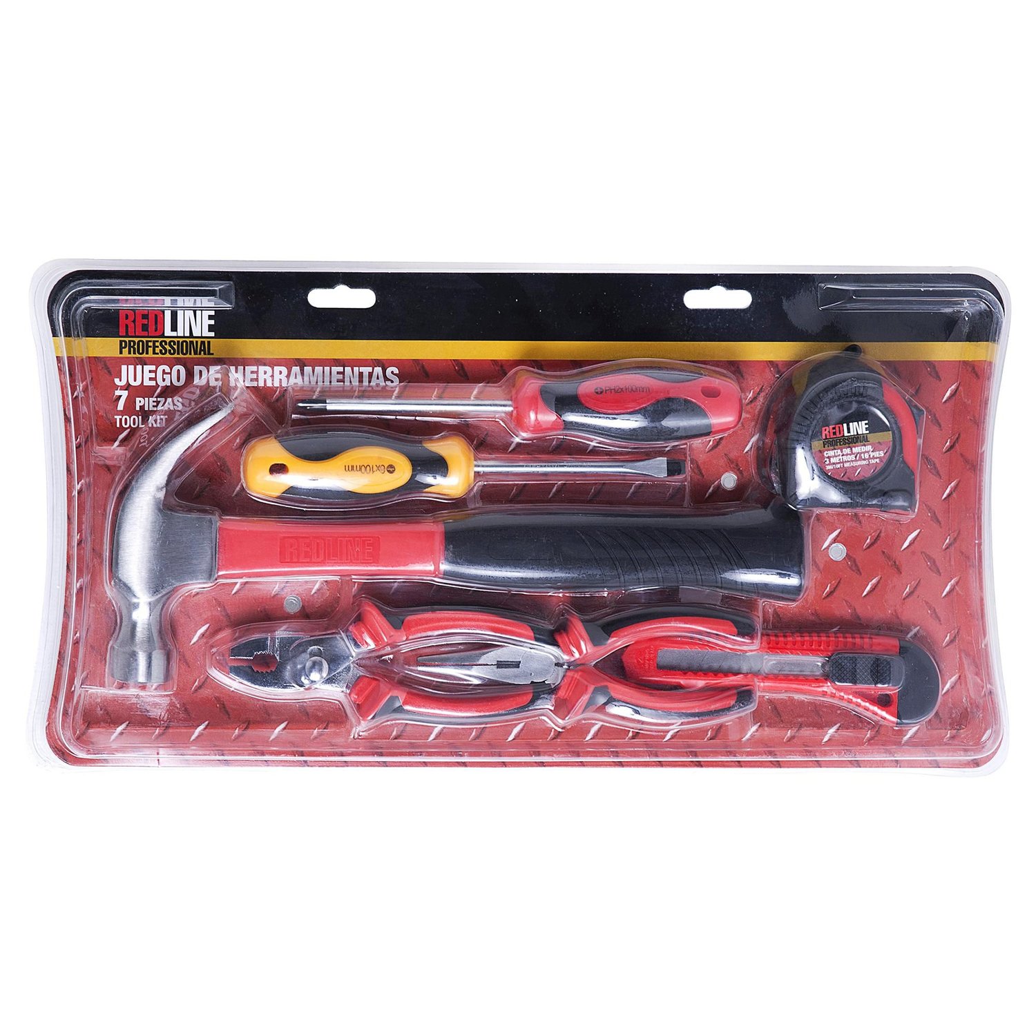 Este set de herramientas Redline incluye un destornillador Phillips de 100 mm, un destornillador de paleta de 6 x 100 mm, un martillo carpintero de 16 oz con mango de fibra de vidrio, alicates articulados y de punta de 150 mm, un cuchillo cartonero de 150 mm y una huincha de medir de 3 metros. El set tiene un largo de 47 cm, un ancho de 24 cm y una altura de 4 cm.