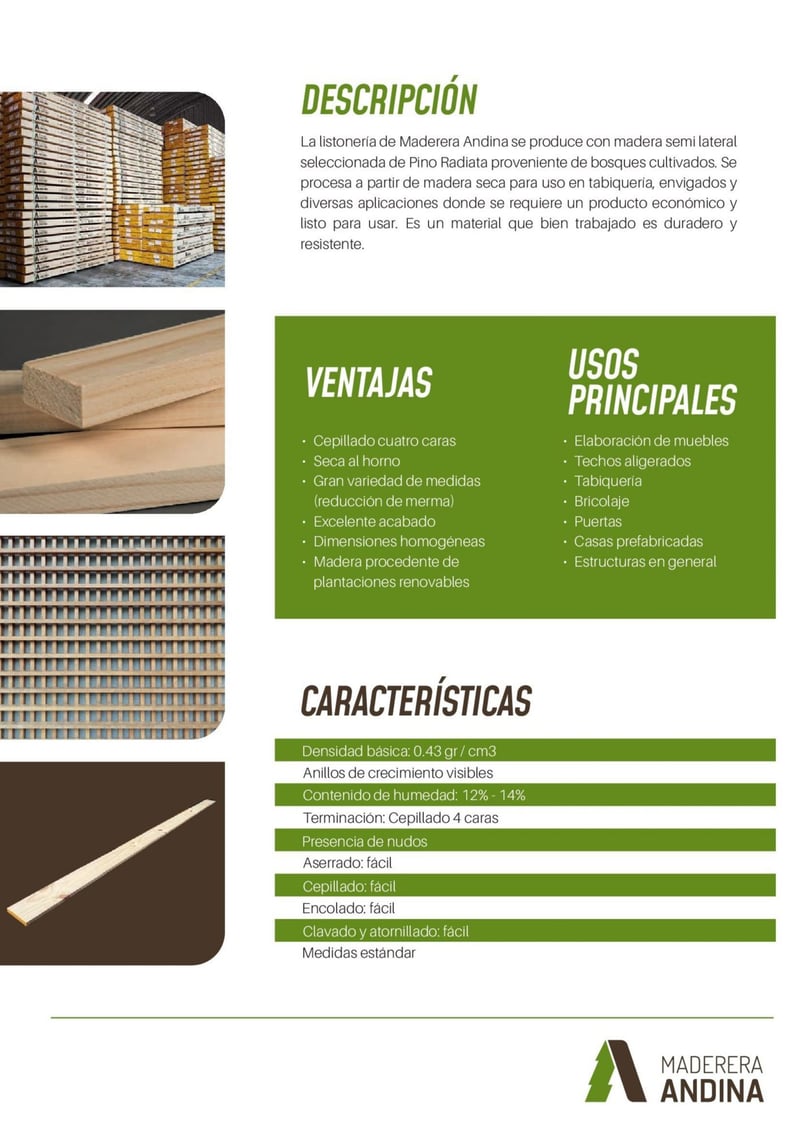 | Características | Carpintería de huecos y revestimientos para puertas, ventanas, tarimas, tableros y contrachapados, Uso: Muebles rústicos de interior |