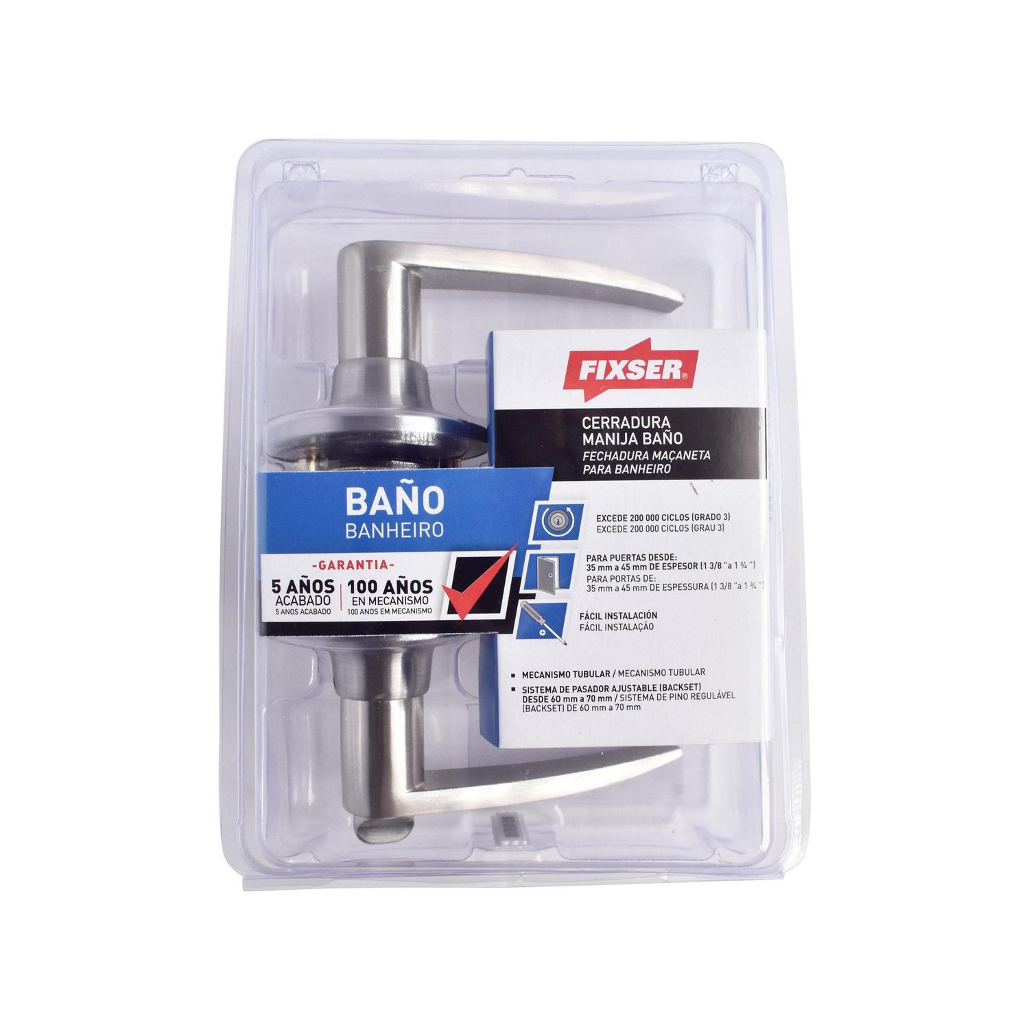 Esta cerradura de baño Fixser es reversible, lo que facilita su instalación en diferentes tipos de puertas. Cuenta con un uso específico para baños, garantizando la privacidad necesaria. El material de la ferretería es zinc, lo que asegura durabilidad. Además, su acabado en acero le da un aspecto moderno y elegante.