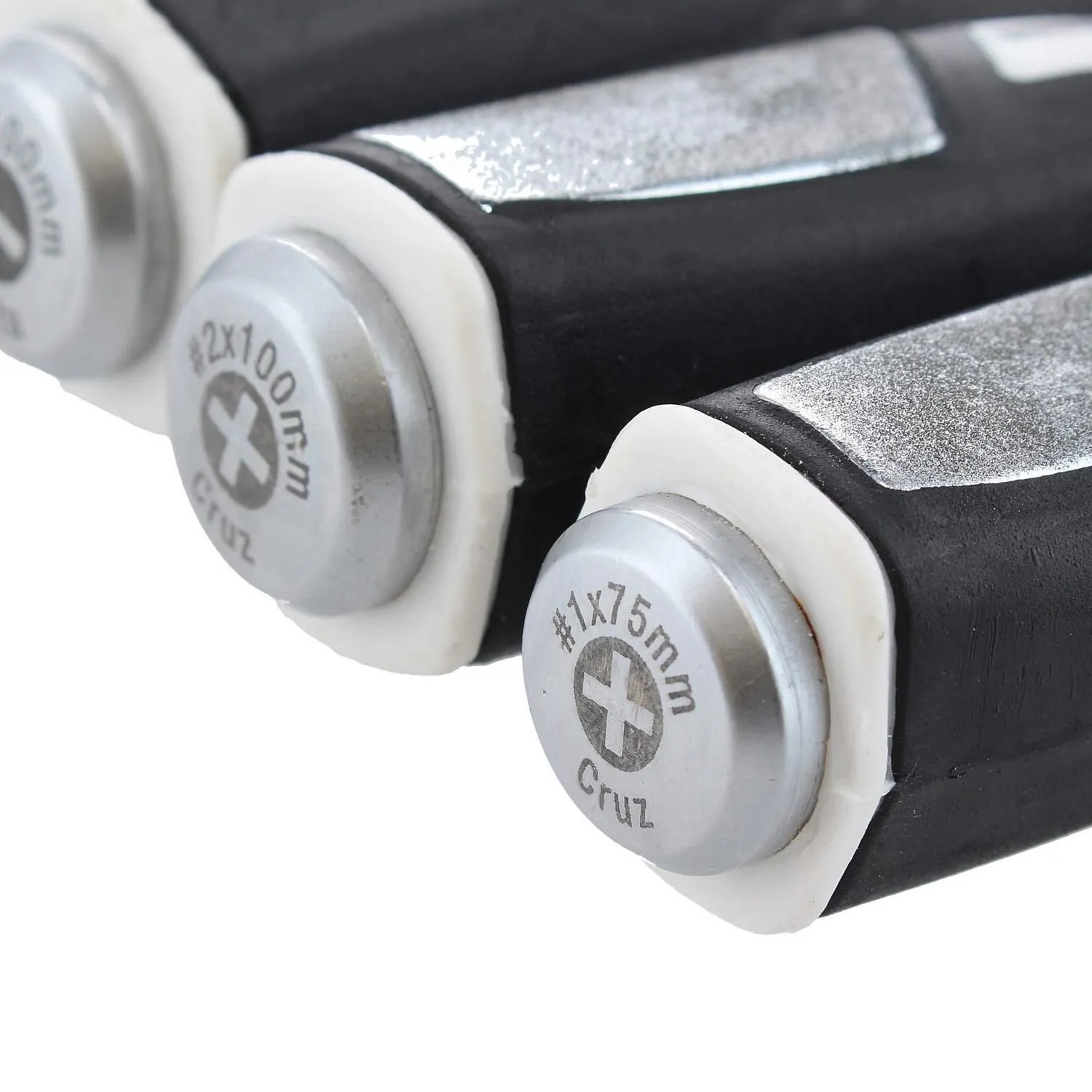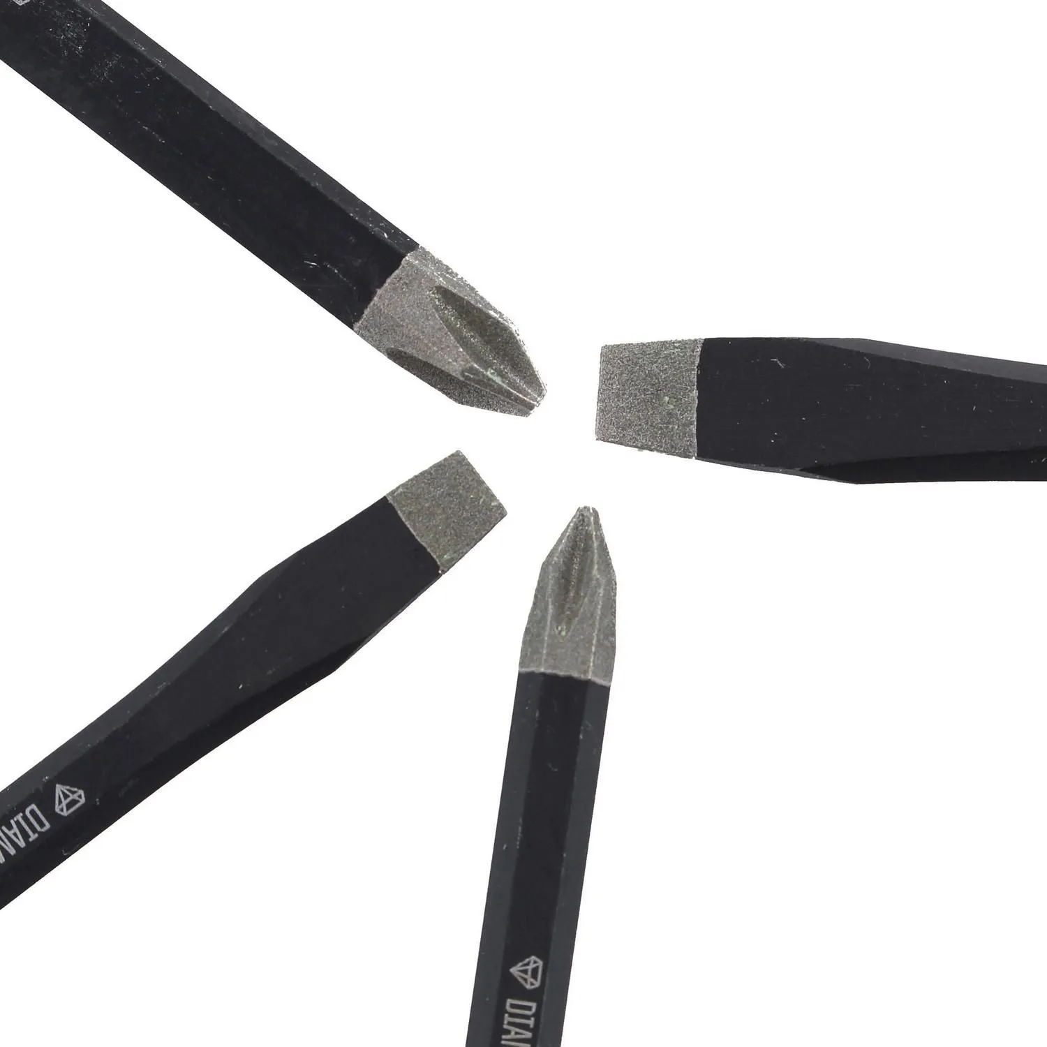 Este set incluye 4 desarmadores de acero de alta resistencia y larga duración. Cuenta con 2 desarmadores de punta plana y 2 de punta cruz, con mangos antideslizantes y puntas con recubrimiento en diamante. Este set es ideal tanto para uso doméstico como profesional, facilitando la identificación de cada pieza gracias a sus distintos tamaños.