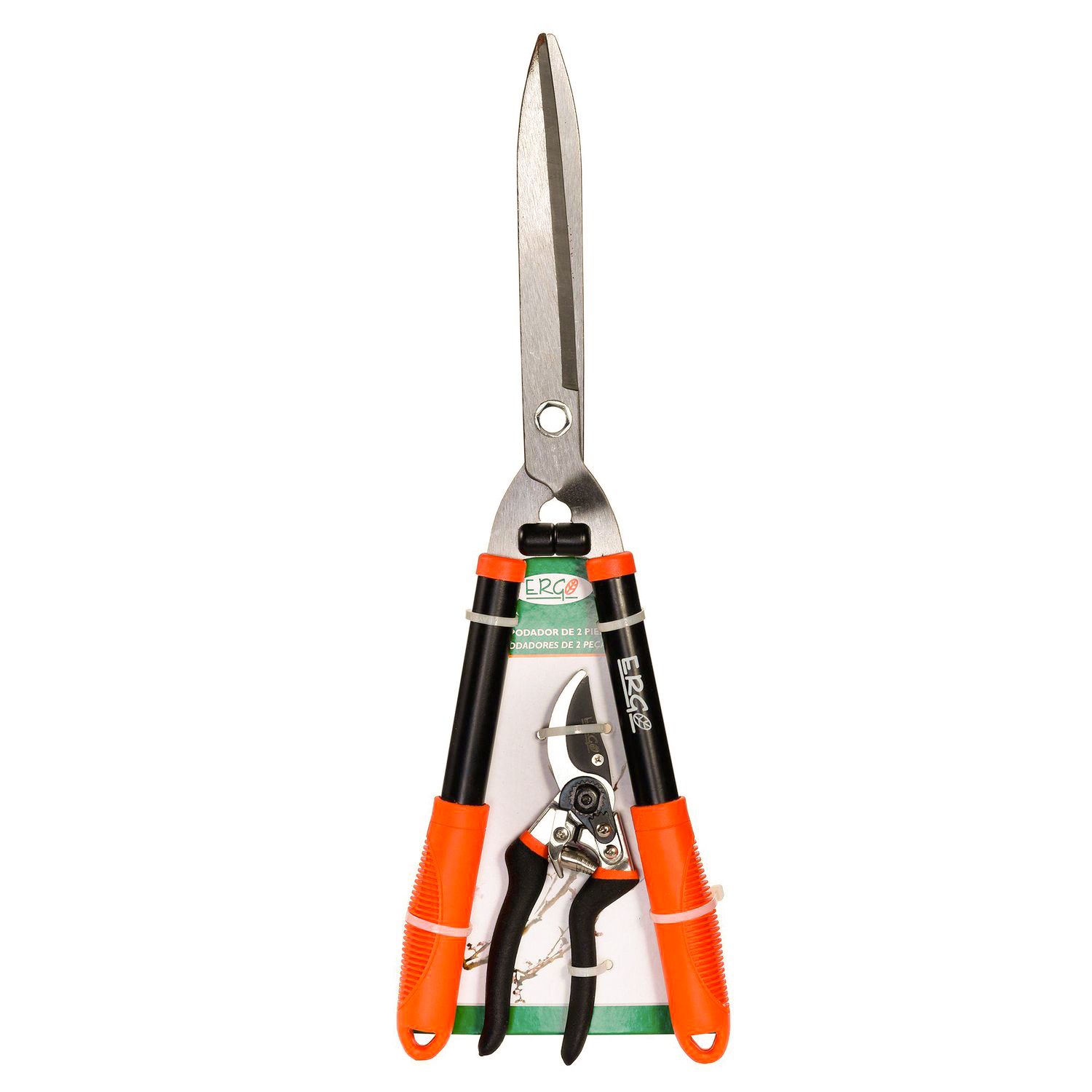 El set incluye una tijera para cortar y emparejar el césped, y una tijera de poda para arbustos y espinas. Con un largo de 54.5 cm, estas tijeras son fáciles de maniobrar y guardar. Fabricadas en acero, garantizan un corte preciso y duradero. Su diseño ergonómico te brinda comodidad durante el uso.