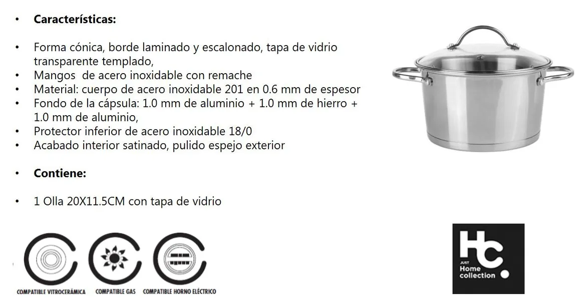 | Características | Forma cónica, borde laminado y escalonado, tapa de vidrio transparente templado, mango de acero inoxidable y perilla con remache, cuerpo de acero inoxidable 201 en 0.6 mm de espesor, fondo de la cápsula: 1.0 mm de aluminio + 1.0 mm de hierro + 1.0 mm de aluminio, acero inoxidable 18/0 Protector inferior de acero. Acabado interior satinado, pulido espejo exterior. |