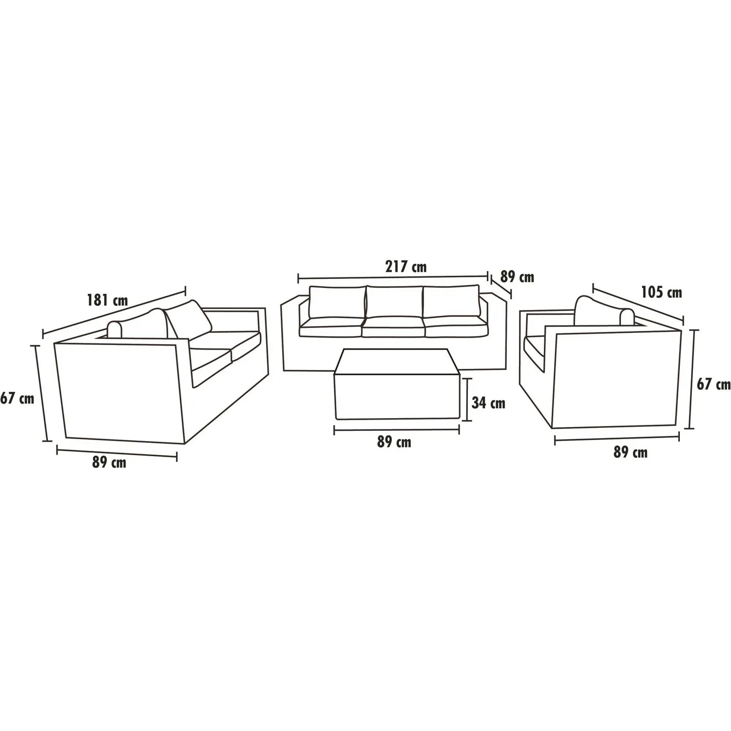 Este juego de living incluye un sillón, un sofá mediano, una mesa y un sofá pequeño. El sofá mediano mide 217 cm de ancho, 89 cm de profundidad y 67 cm de alto, mientras que el sillón mide 181x89x67 cm. El material principal es polirratán, lo que asegura una larga vida útil. Además, cuenta con apoyabrazos para mayor comodidad.