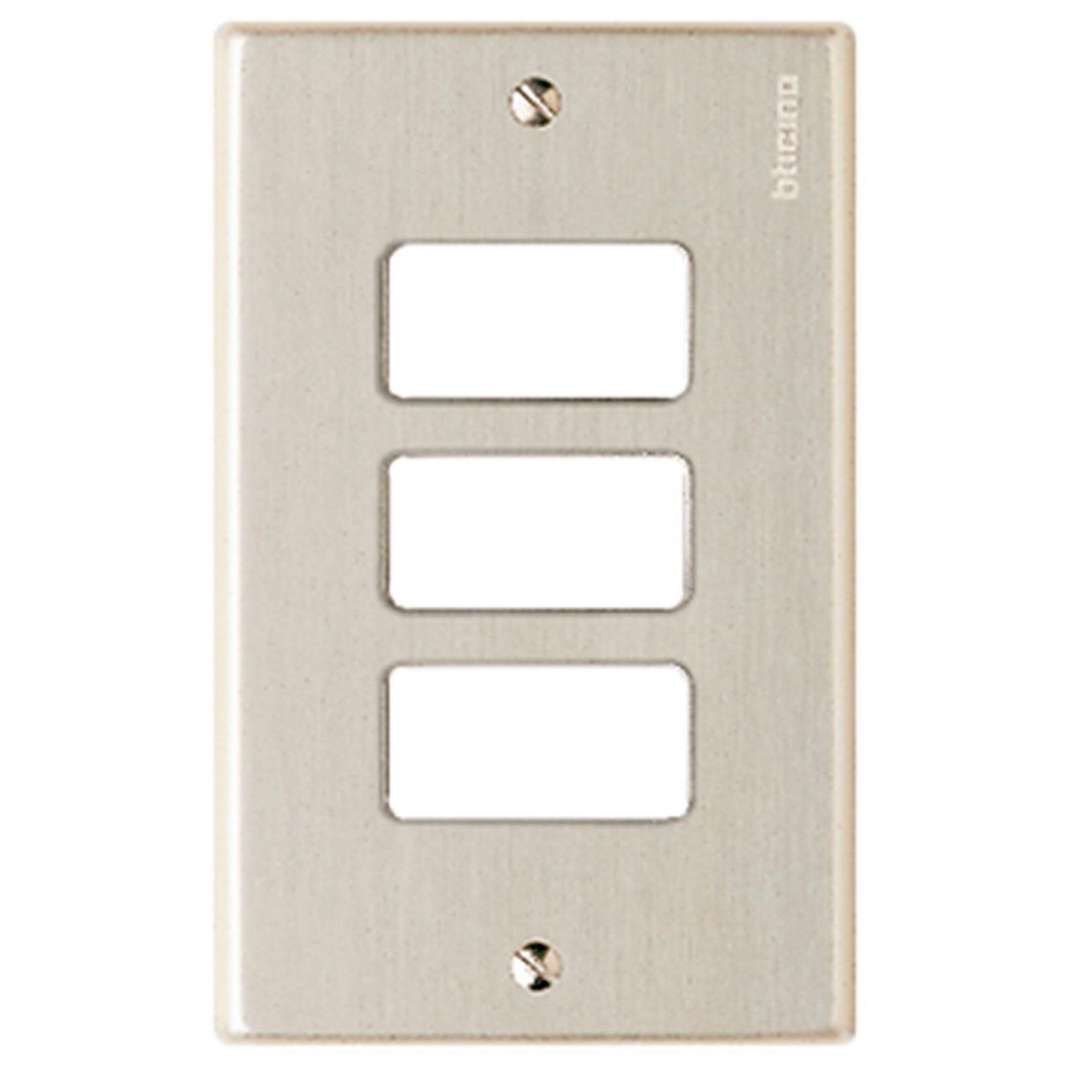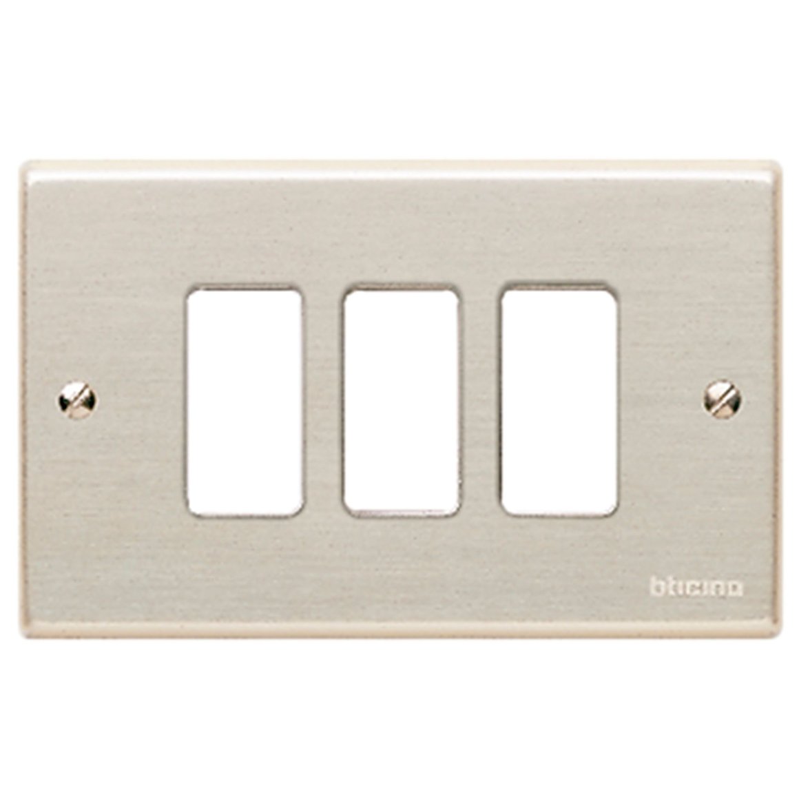 La Placa Triple Magic Champagne es un módulo para placa de tipo embutida, con un ancho de 12 cm, un largo de 2.5 cm y un alto de 7 cm. Está fabricada en aluminio y tiene un peso de 0.051 kg. Su uso principal es para el cierre de instalación eléctrica, y cuenta con 0 agujeros. La placa tiene un color champagne y pertenece a la línea Magic de Bticino.