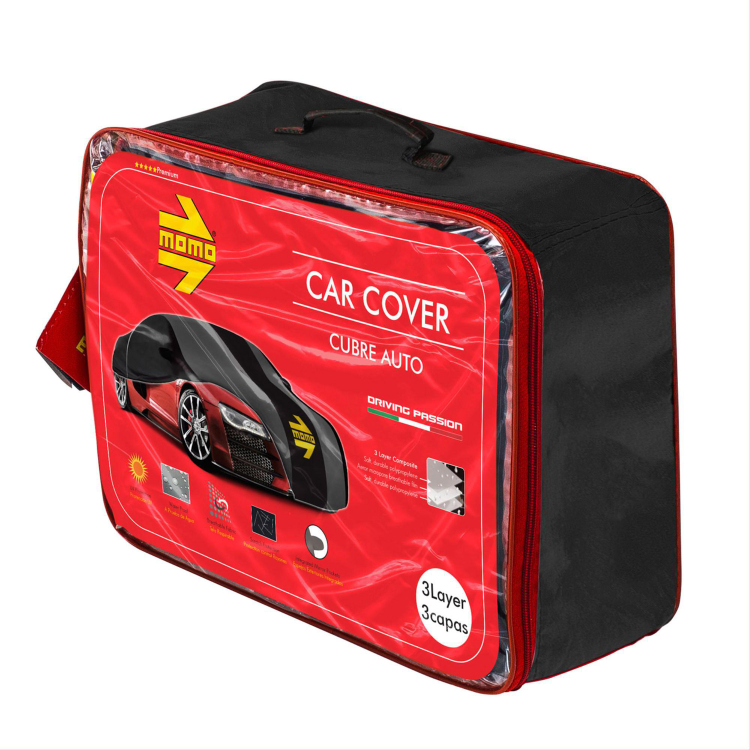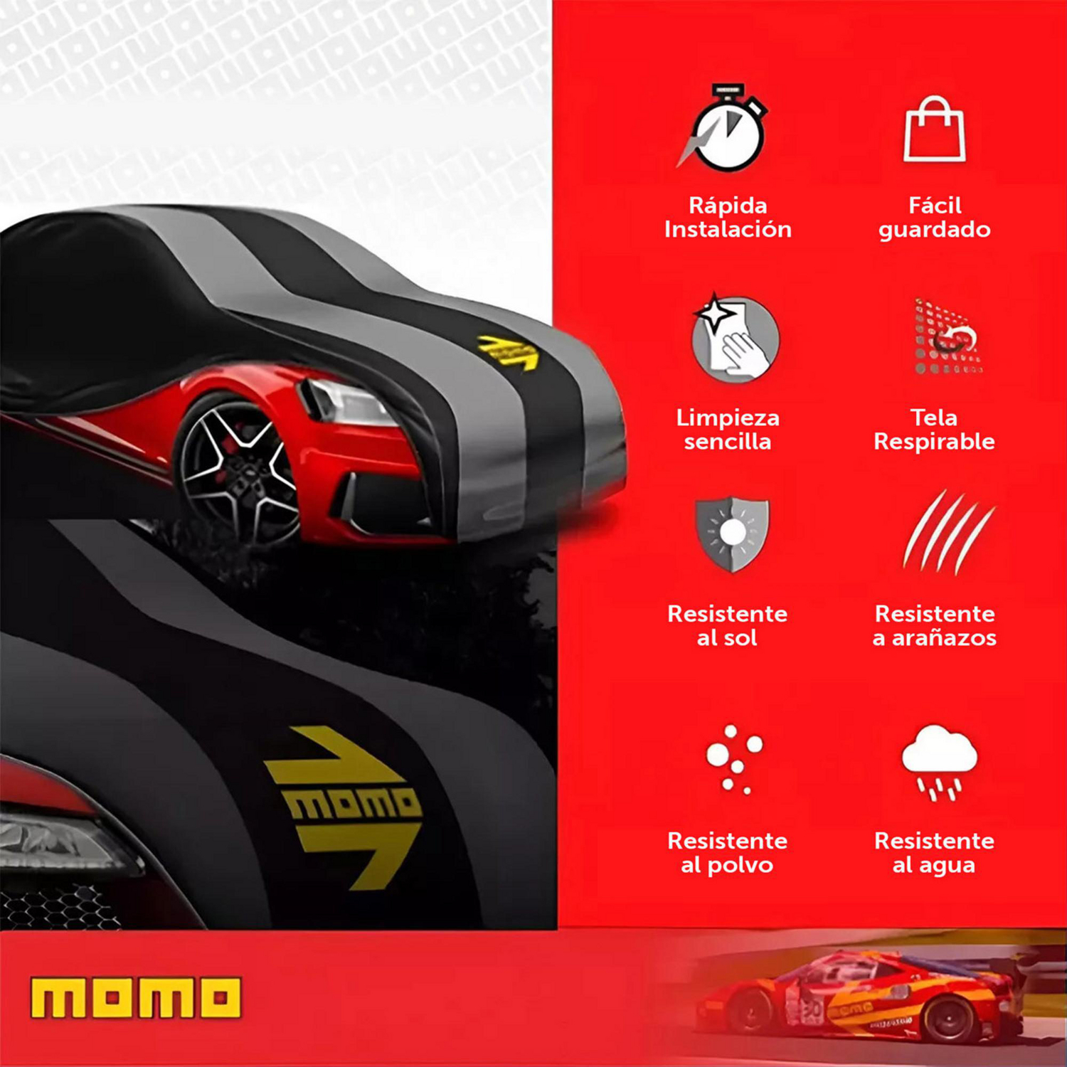 Este cobertor de auto Momo, de talla L, cuenta con un exterior de secado rápido e impermeable, y un interior extra suave para evitar rayaduras. Sus pretinas elásticas y correa de sujeción aseguran un ajuste perfecto. Además, incluye cintas reflectivas y cierre a la altura de las puertas. Con una duración de vida de 4 a 5 años, es una inversión inteligente para tu vehículo.