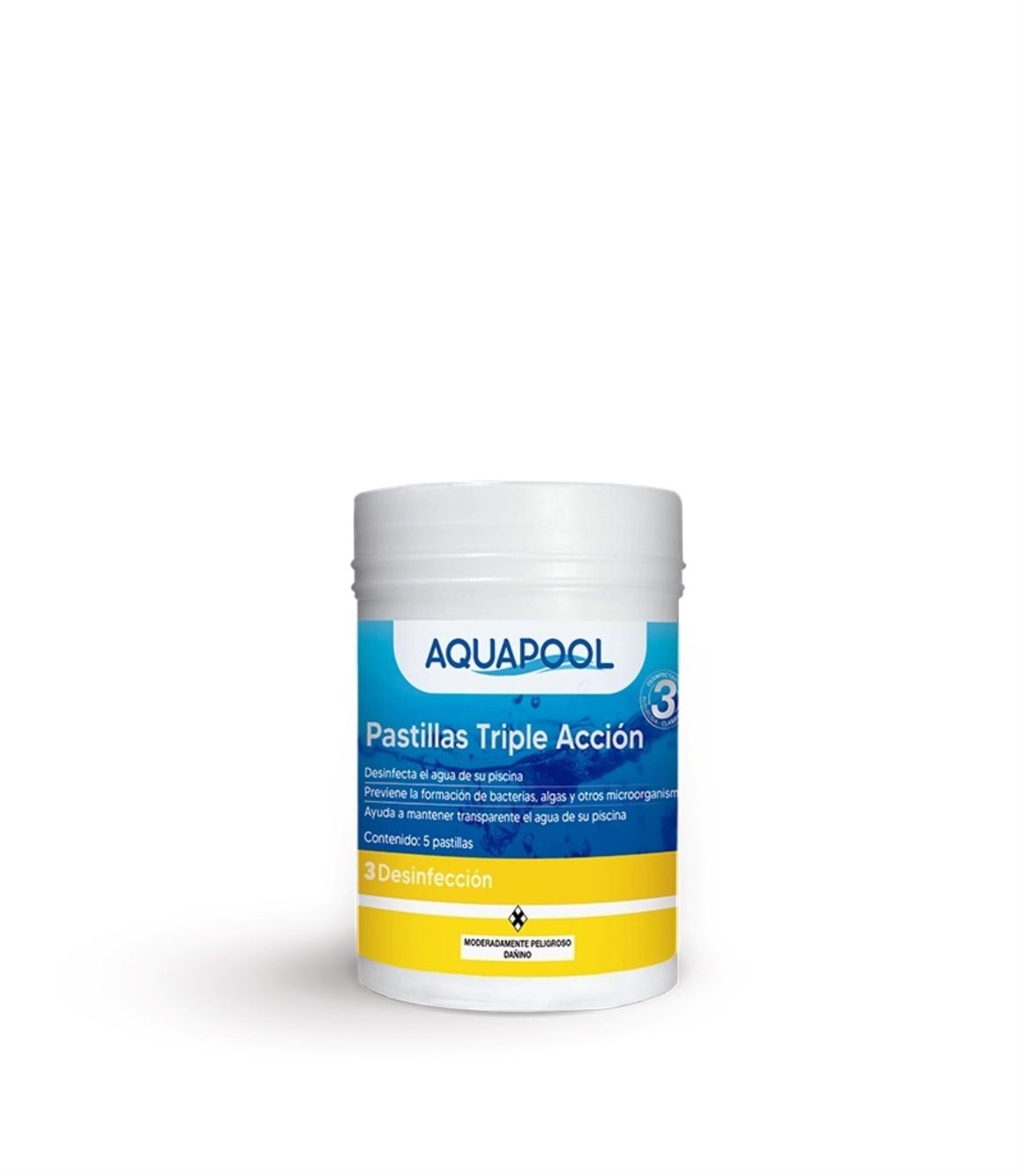 Mantén el agua de tu piscina limpia y cristalina con el cloro triple acción de Aquapool. Este producto te ayudará a eliminar gérmenes e impurezas, manteniendo tu piscina lista para disfrutar en familia. Contiene 5 pastillas que te permitirán mantener el agua limpia por más tiempo.