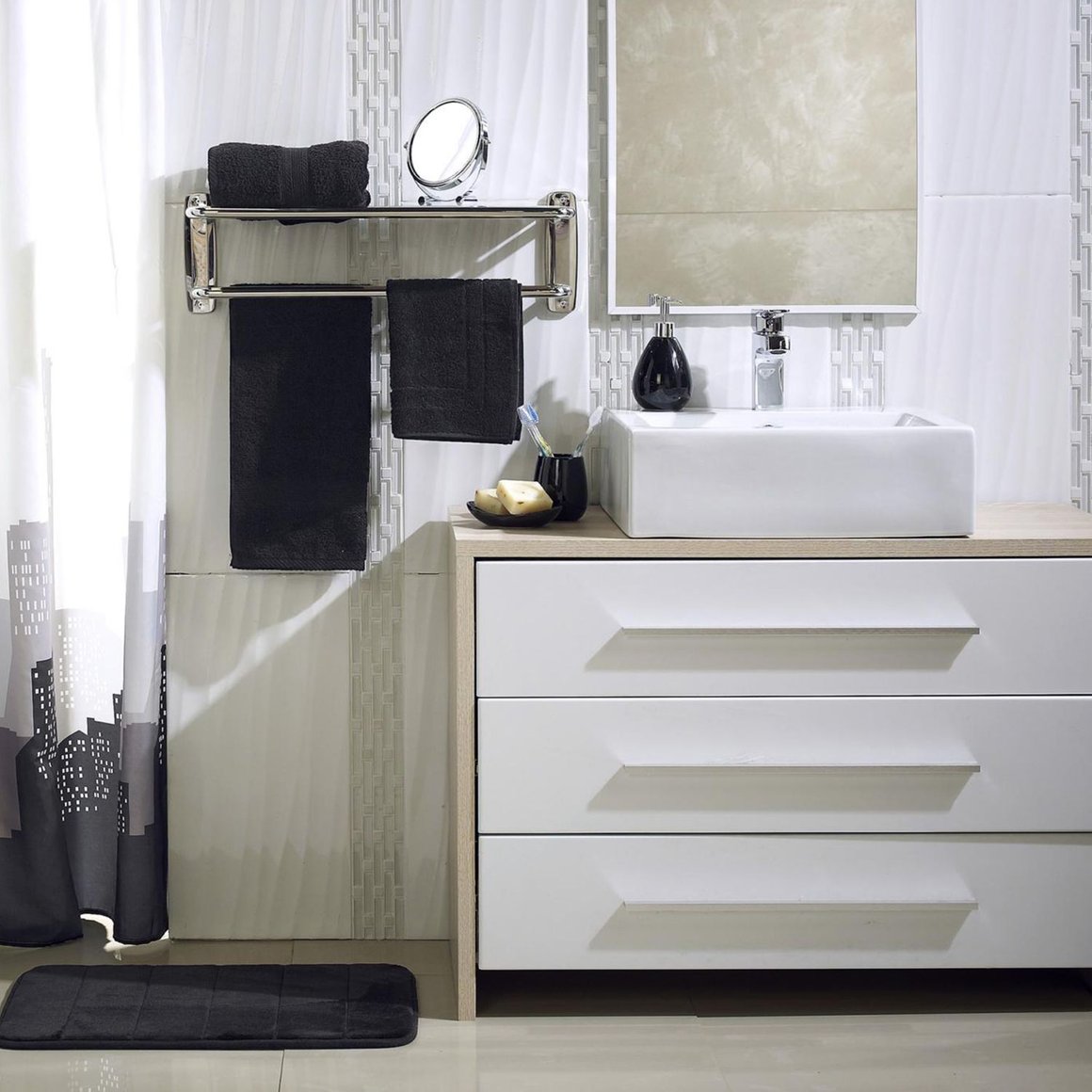 Complementa tu espejo con accesorios para baño, como dispensadores de jabón y jaboneras, para mantener tu espacio organizado y con estilo. También puedes considerar las papeleras, para mantener el orden y la limpieza en tu baño.