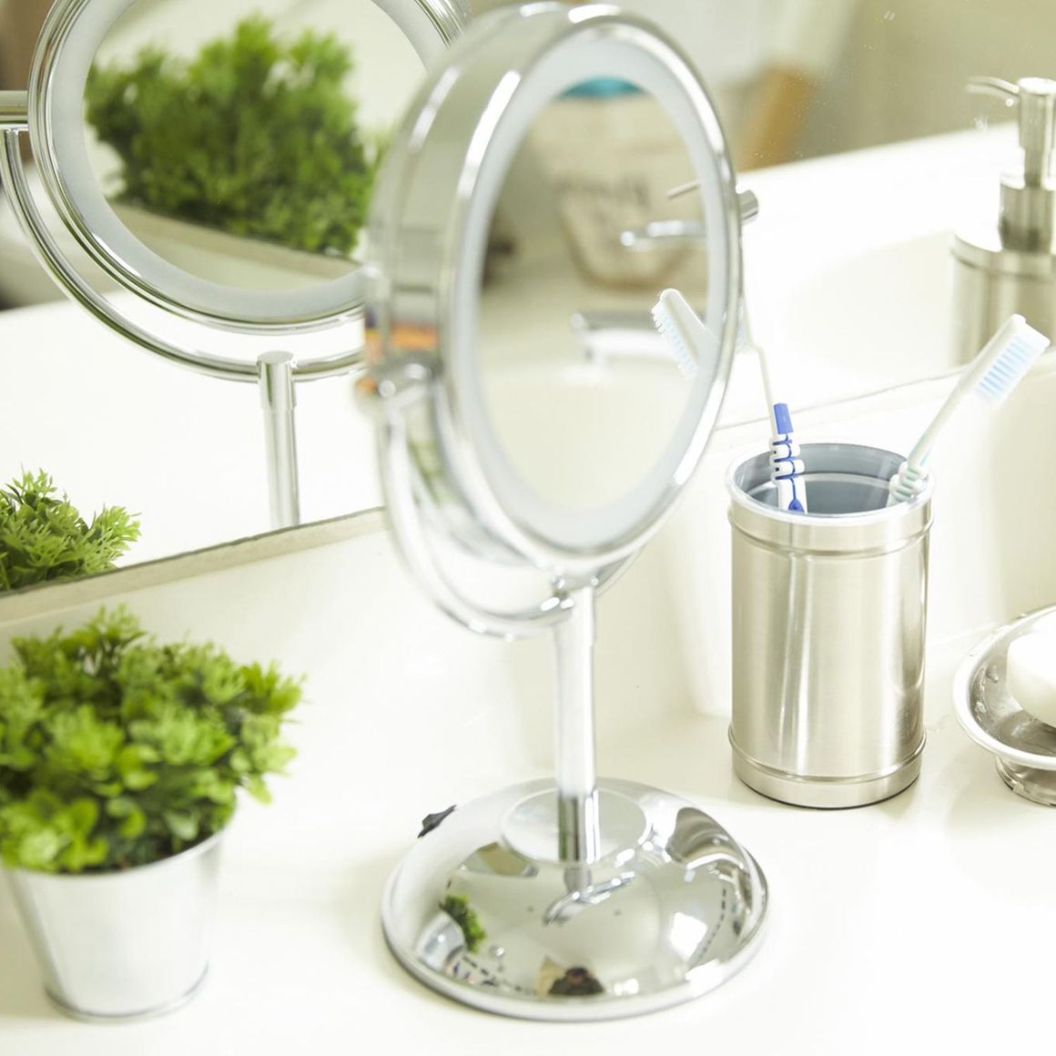 ¡Dale un toque de elegancia a tu rutina de belleza con el Espejo Cosmético Giratorio de Home Collection! Este espejo de aumento 2X con luz incorporada es el compañero perfecto para tu baño. Su diseño plateado combina con cualquier estilo y te permite ver cada detalle de tu rostro. ¡Prepárate para lucir radiante!