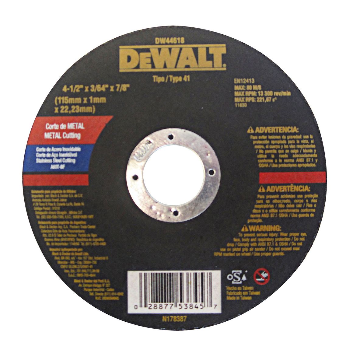 Este disco de corte Dewalt, modelo DW44618, está diseñado para ofrecer un rendimiento óptimo. Con un largo de hoja de 11.5 cm y un espesor de 0.2, este disco es ideal para trabajos de corte en acero inoxidable. Su velocidad de rotación máxima es de 13300 min, lo que garantiza cortes rápidos y limpios. Recuerda que incluye 1 disco DW44618.