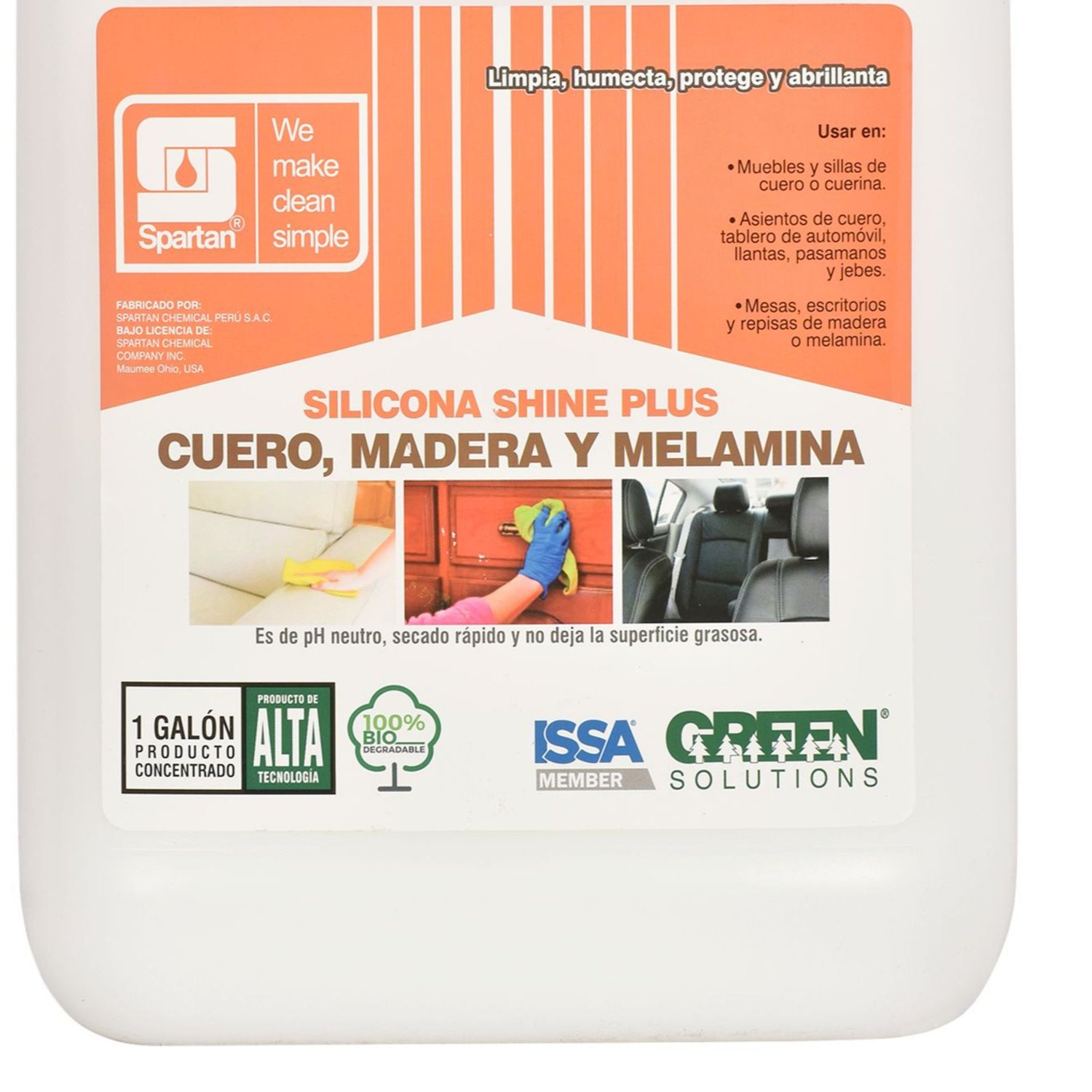 Dale a tus muebles y superficies un brillo impecable con la Silicona Shine Plus 1 Galón de Spartan. Esta silicona multiusos limpia, humecta, protege y abrillanta, dejando un acabado impecable en cuero, madera y melamina. Su fórmula de pH neutro se seca rápidamente y no deja la superficie grasosa, ideal para mantener tus muebles y superficies como nuevos.