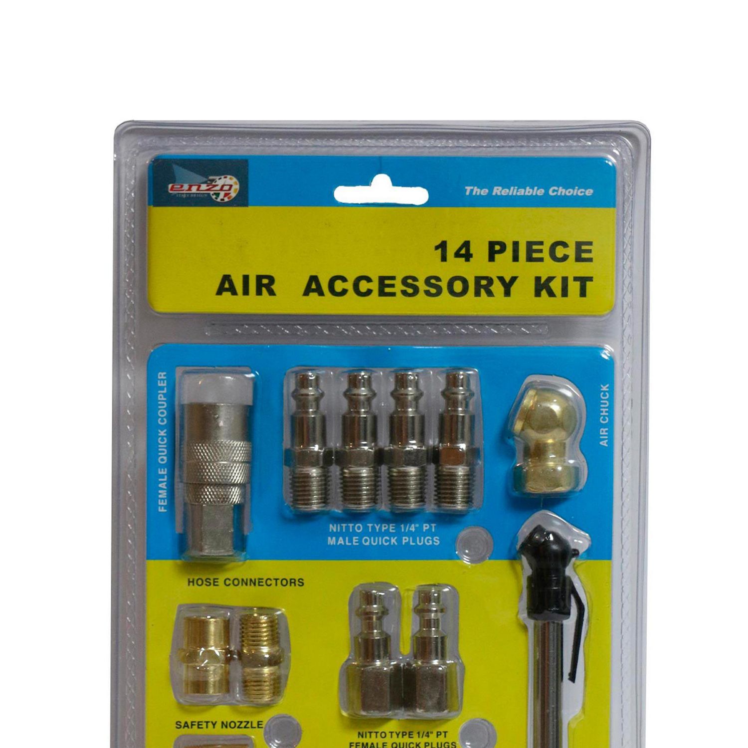 Este kit de accesorios para neumáticos de Major te permite sacar mayor provecho a los compresores de aire. Contiene 2 conectores rápidos macho hilo interno de 1/4' , 1 conector rápido hembra de 1/4' , 1 conector doble macho de 1/4' , 4 conectores rápidos macho hilo externo de 1/4' y 1 conector doble hembra de 1/4' . Además, incluye una aguja para inflar, un adaptador de válvula neumática, un medidor de presión, una pistola para soplar y una boquilla de seguridad. Todo esto te permitirá realizar una variedad de tareas con mayor facilidad y precisión.
