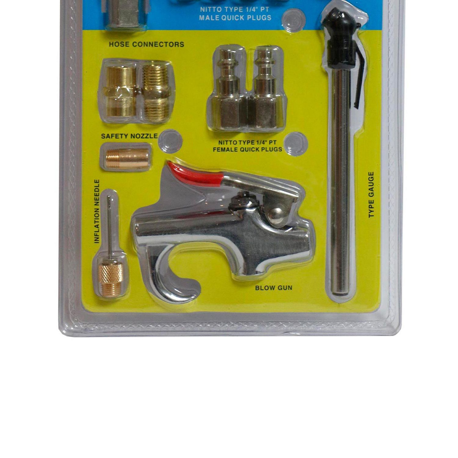 | Incluye | 2 conectores rápido macho hilo interno 1/4", 1 conector rápido hembra 1/4", 1 conector doble macho 1/4", 4 conectores rápido macho hilo externo 1/4" y 1 conector doble hembra 1/4", 1 aguja para inflar, 1 adaptador válvula neumática, 1 medidor de presión, 1 pistola para soplar y 1 boquilla de seguridad |