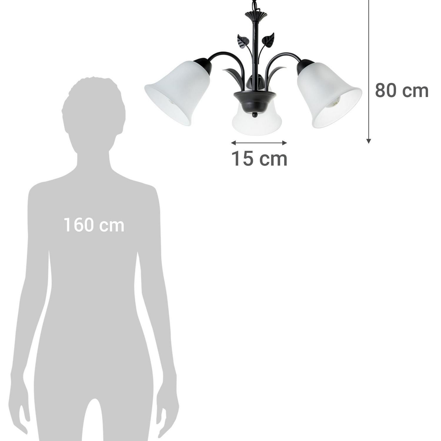 Esta lámpara colgante tiene una altura total de 80 cm y un diámetro de 56 cm. Cada uno de sus focos de vidrio tiene un diámetro de 15 cm. Acepta ampolletas de rosca E27 con una potencia máxima de 60W. Incluye 3 unidades de ampolletas y su voltaje es de 220 V.
