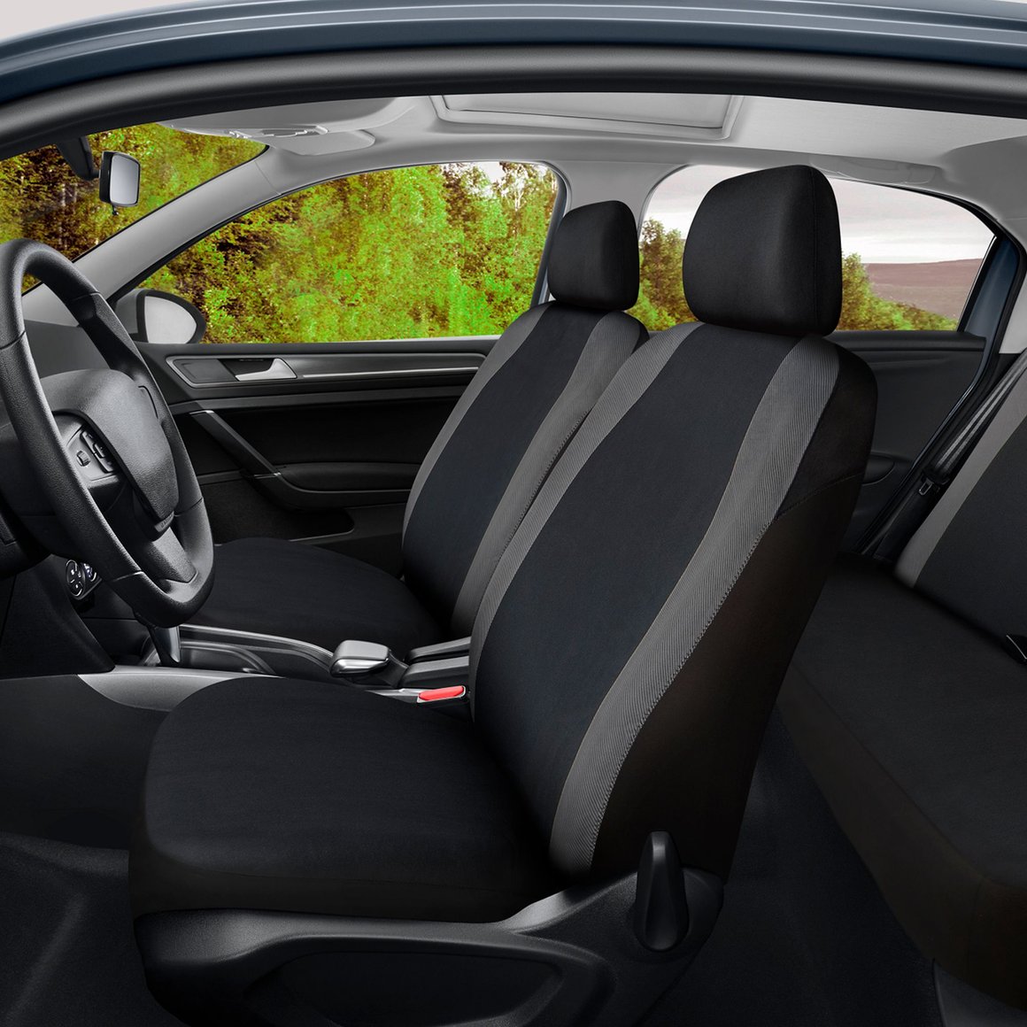 Estas fundas están hechas de poliéster Jacquard con espuma, lo que facilita su instalación y ajuste universal. El set incluye fundas para asientos delanteros, traseros y apoya cabezas. Su color negro y gris le dará un toque moderno a tu vehículo. Además, si no estás conforme con tu compra, cuentas con 3 meses de garantía para devolución.