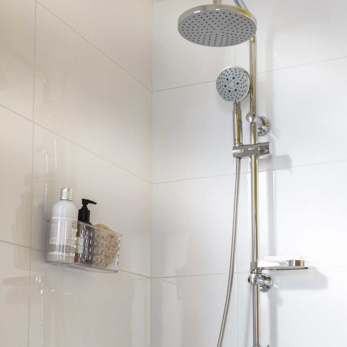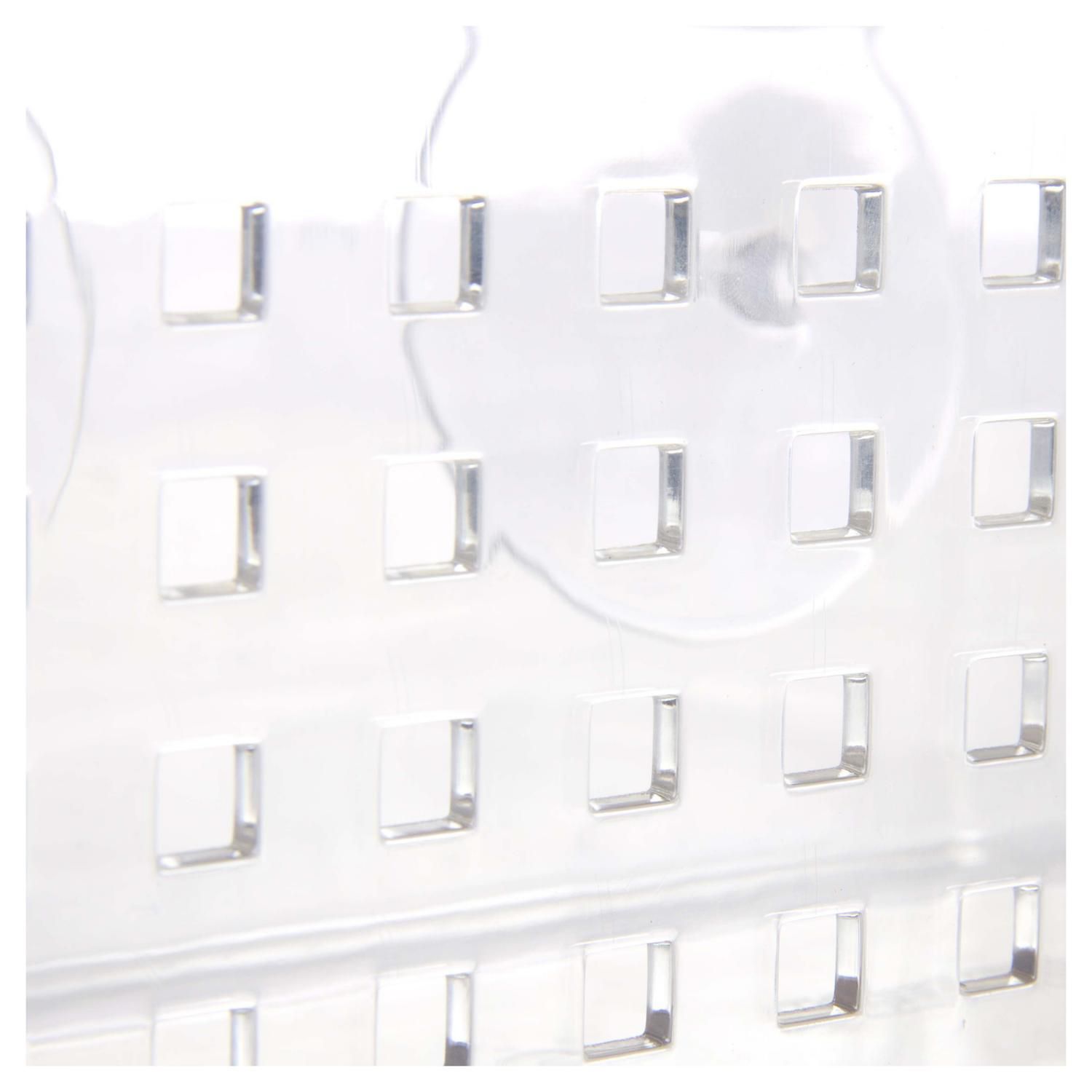 Este canasto de ducha horizontal de succión, fabricado en plástico, es rígido y resistente a la humedad. Sus dimensiones son de 25.9 cm de ancho, 10.9 cm de largo y 13 cm de alto. Cuenta con orificios que evitan la acumulación de agua y ventosas para fijarlo a los azulejos. Su material es de fácil mantenimiento, y su diseño transparente lo hace combinable con cualquier revestimiento.