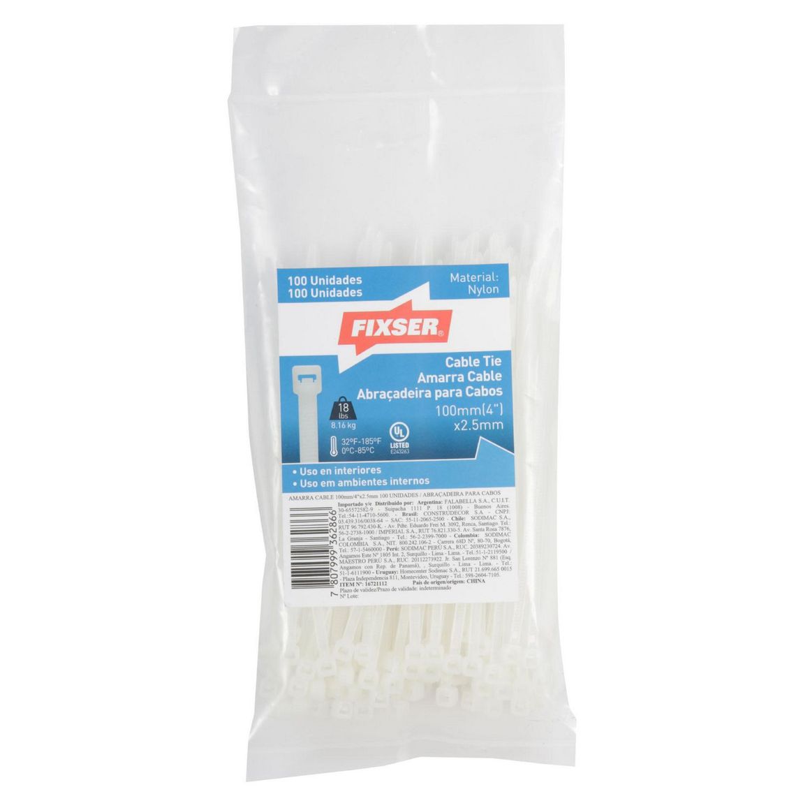 ¡Optimiza tus instalaciones eléctricas con los cintillos blancos de Fixser! Estos prácticos amarra cables, con medidas de 100 mm de largo por 2.5 mm de ancho, son la solución perfecta para mantener tus cables organizados y seguros. Su diseño discreto y color blanco se integran a la perfección en cualquier ambiente, brindando una presentación impecable.