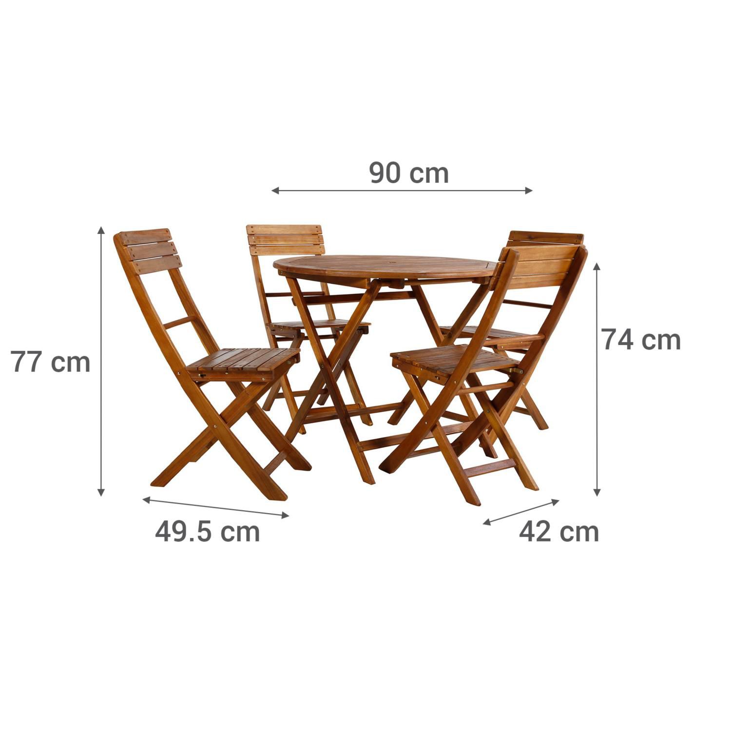 Este juego de comedor incluye 4 sillas y una mesa, ideal para 4 personas. La mesa tiene unas dimensiones de 90x74 cm, y las sillas miden 59x38x84,5 cm. Además, son plegables, lo que facilita su almacenamiento cuando no están en uso. Para mantener la madera de acacia en perfectas condiciones, se recomienda aplicar aceite de teca al inicio y al final de cada temporada.