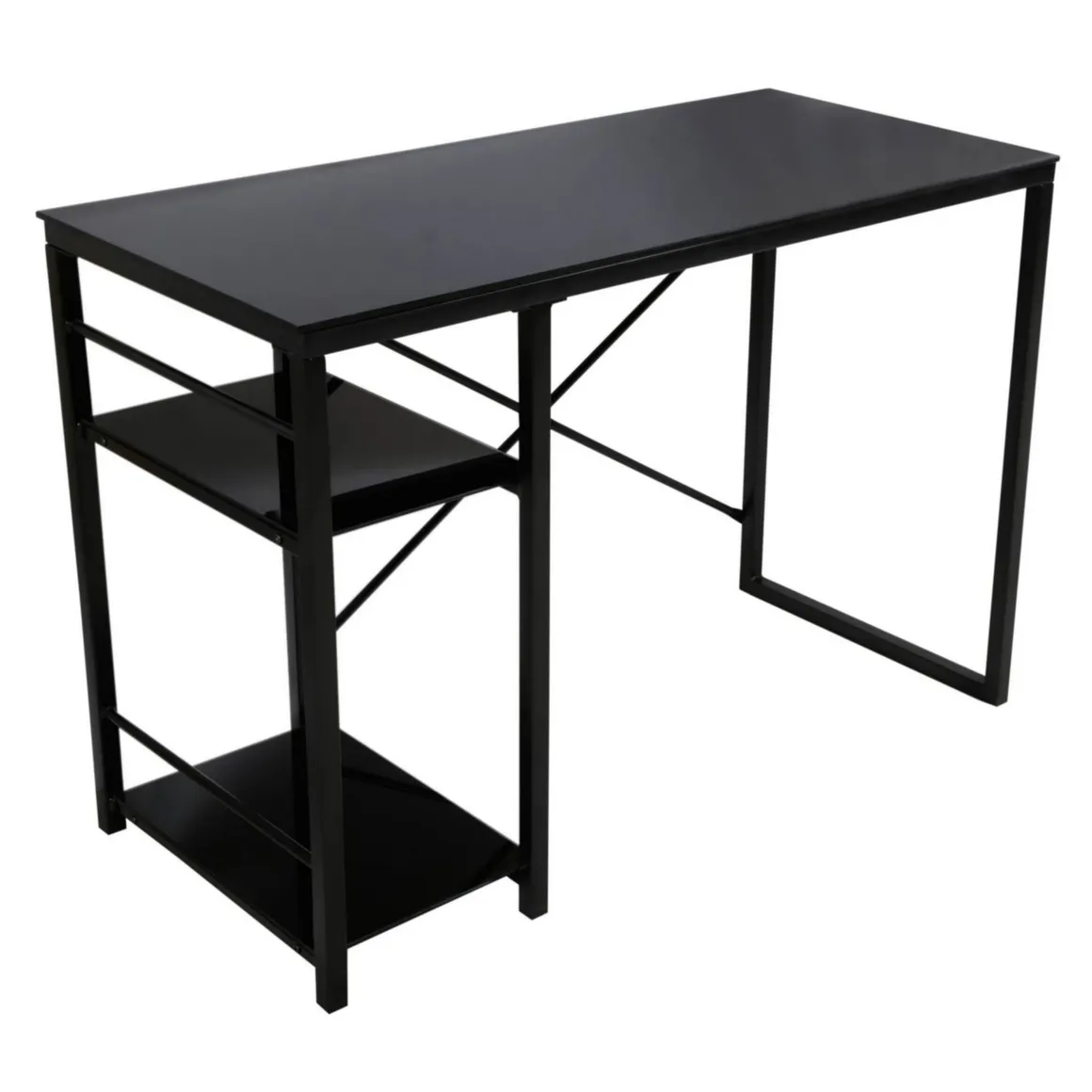 Este escritorio de Just Home Collection tiene un ancho de 110 cm y una profundidad de 50 cm, ofreciendo un amplio espacio para trabajar o estudiar. Su altura es de 76 cm y está fabricado con metal, lo que garantiza su durabilidad. Su forma rectangular y su color negro lo hacen versátil para cualquier ambiente. Cuenta con una mesa de vidrio.