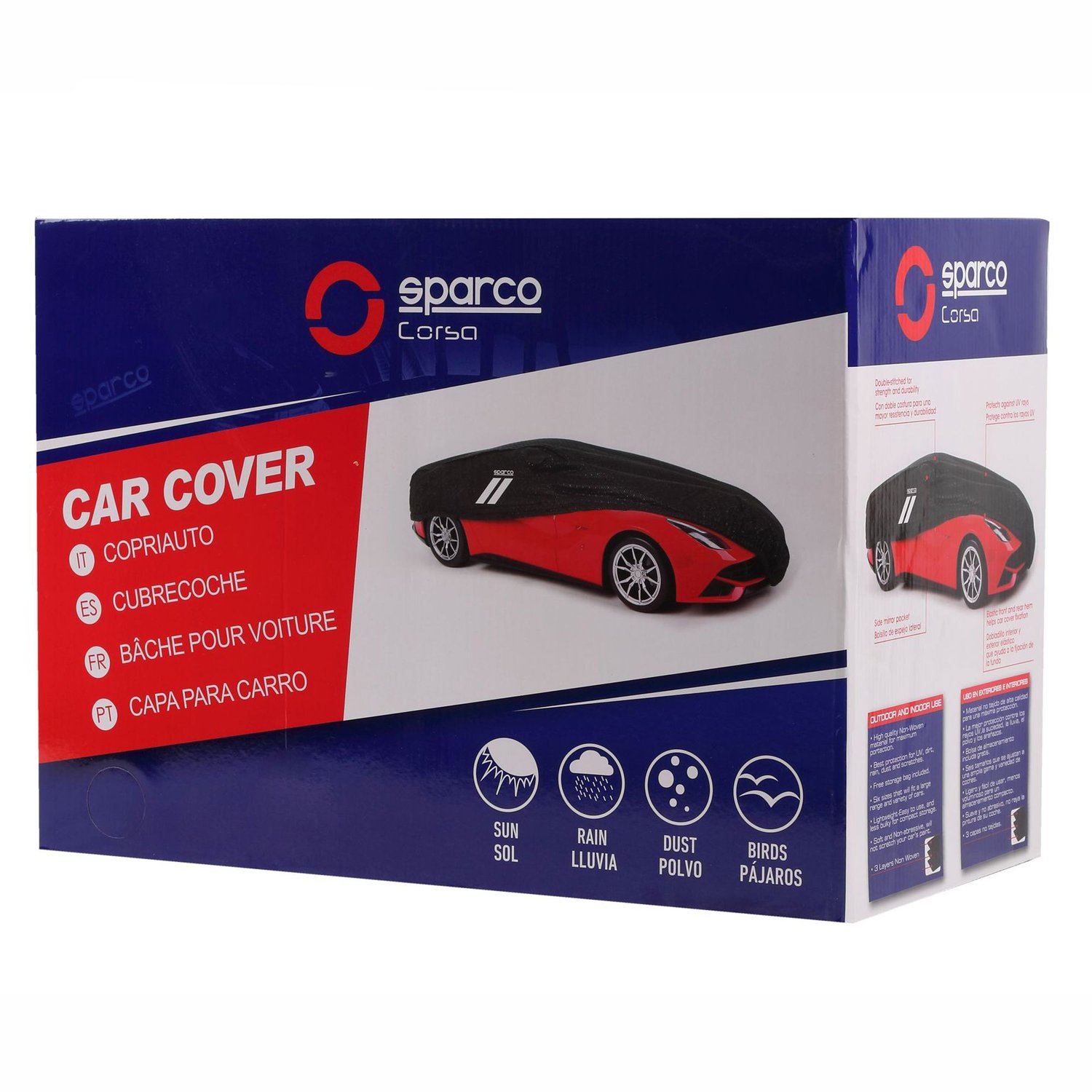 Este cobertor Sparco, protege contra los rayos UV y soporta el intenso calor. Su diseño impermeable, con exterior de secado rápido y pretinas elásticas, asegura una correcta sujeción. Además, cuenta con cintas reflectivas y cierre a la altura de las puertas. Con una duración de vida de 4 a 5 años, este cobertor es una inversión inteligente para tu vehículo.