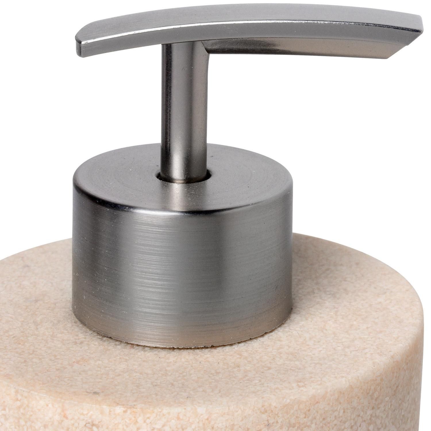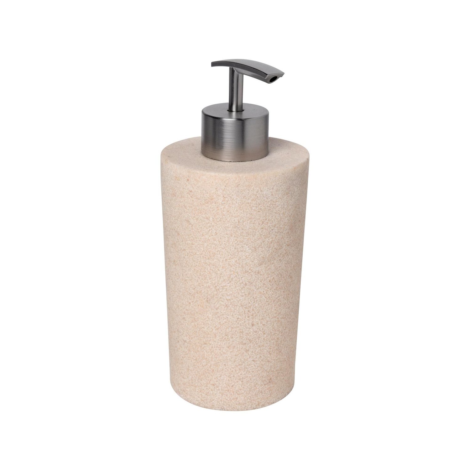 Este dispensador de jabón, fabricado en piedra y resina, tiene unas dimensiones de 7.5 cm de largo, 7.5 cm de ancho y 17.5 cm de alto, con una capacidad volumétrica de 310. Su diseño incluye un dispensador de jabón líquido para baños, lo que facilita su uso diario. El modelo Piedra es ideal para quienes buscan un accesorio duradero y con estilo.