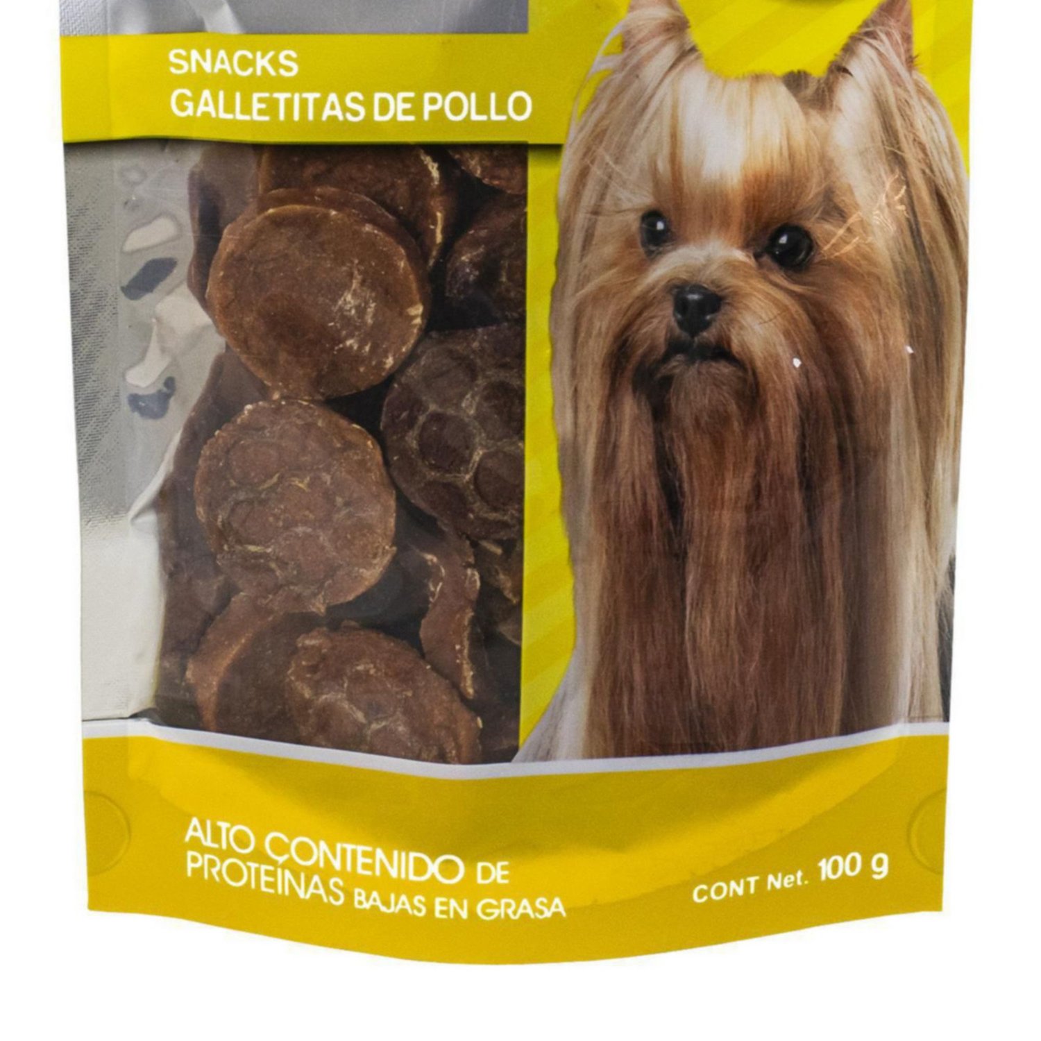 Estos snacks están diseñados especialmente para perros adultos. Cada galletita contiene 100 gr de alimento seco, con un sabor natural que a tu mascota le encantará. Están elaborados con un 80% de pollo y un 20% de arroz, y se recomienda almacenarlos en lugares frescos y secos.