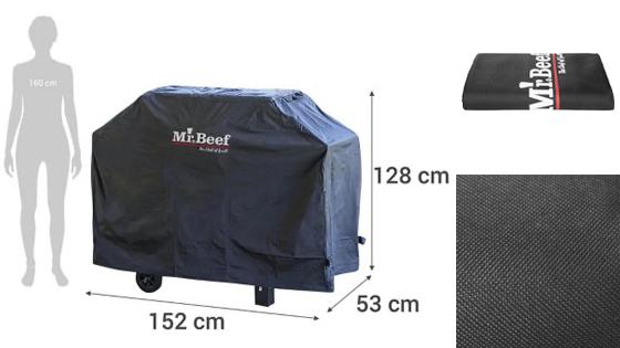Está fabricada en plástico de superficie lisa y suave al tacto. Esto la hace de fácil limpieza. Lo puedes hacer con agua a baja presión y secarla al natural o con un paño suave.Se adapta a las distintas formas de parrilla que se ajusten a sus medidas de 152 x 53 x 128 cm.Los bordes de la Funda para Parrilla Grande de Mr. Beef tienen corte recto, lo que la mantienen libre de deformaciones.