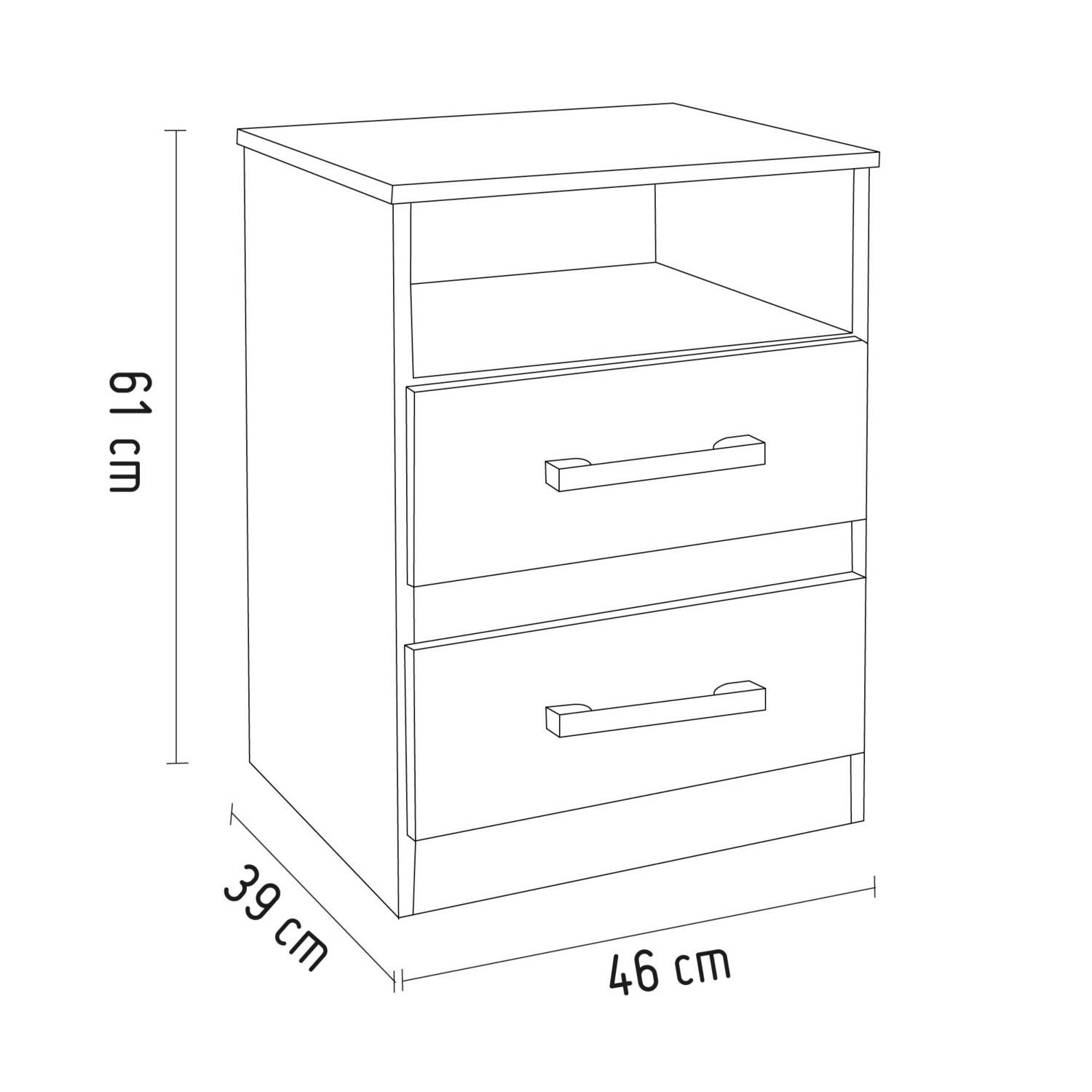 Este velador cuenta con un ancho de 46 cm y una altura de 61 cm, ideal para espacios reducidos. Está fabricado en MDP con un acabado mate, lo que le da un aspecto moderno y duradero. Incluye un manual de armado y se recomienda usar productos especiales para su limpieza. El material del fondo de cajón es MDF y la medida externa de cada cajón es de 43 x 16 cm en el frente.