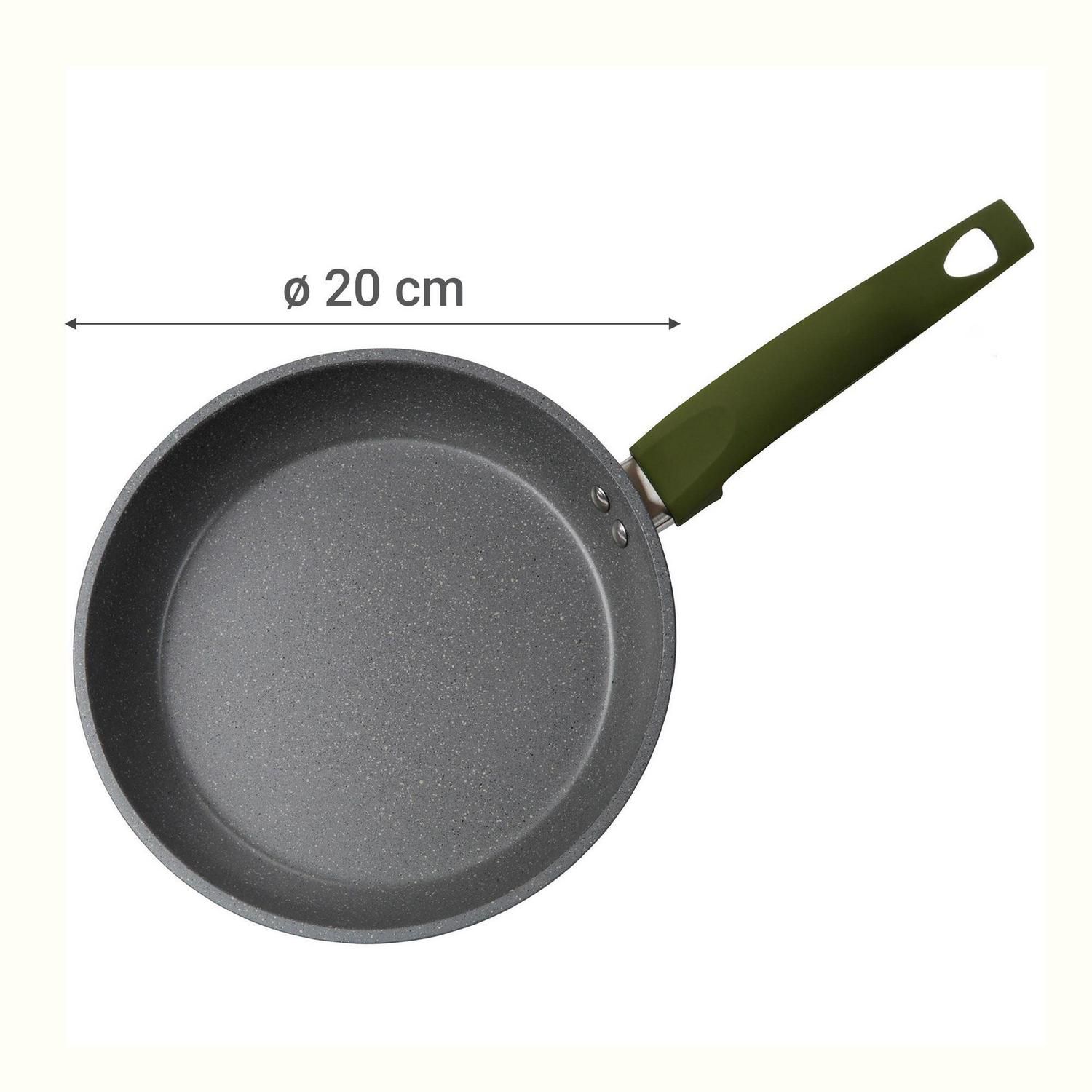 Esta sartén cuenta con un diámetro de 20 cm y está fabricada en aluminio, lo que asegura una distribución uniforme del calor. Su revestimiento interior es de politetrafluoroetileno (antiadherente), ideal para una cocción sin problemas. El mango ergonómico de color verde oliva te brindará un agarre cómodo y seguro. Además, es una sartén que cuenta con antiadherente.