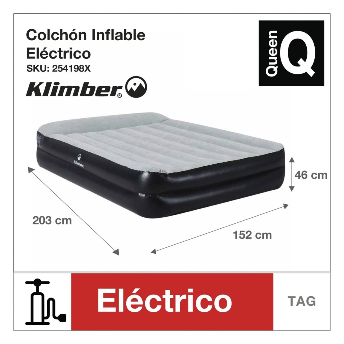 Este colchón Klimber tiene un largo de 203 cm, un ancho de 152 cm y una altura de 46 cm, ideal para dos personas. Su color es gris y soporta hasta 180 kg. Cuenta con un voltaje de 110 V, lo que lo hace práctico para usar en diferentes lugares.