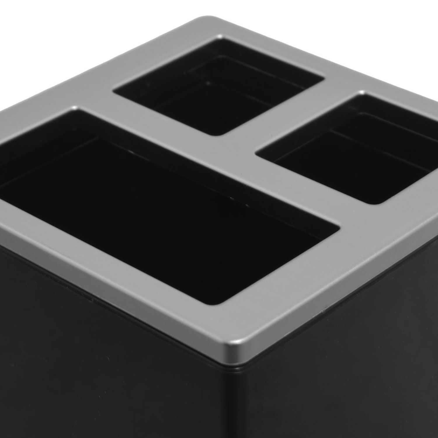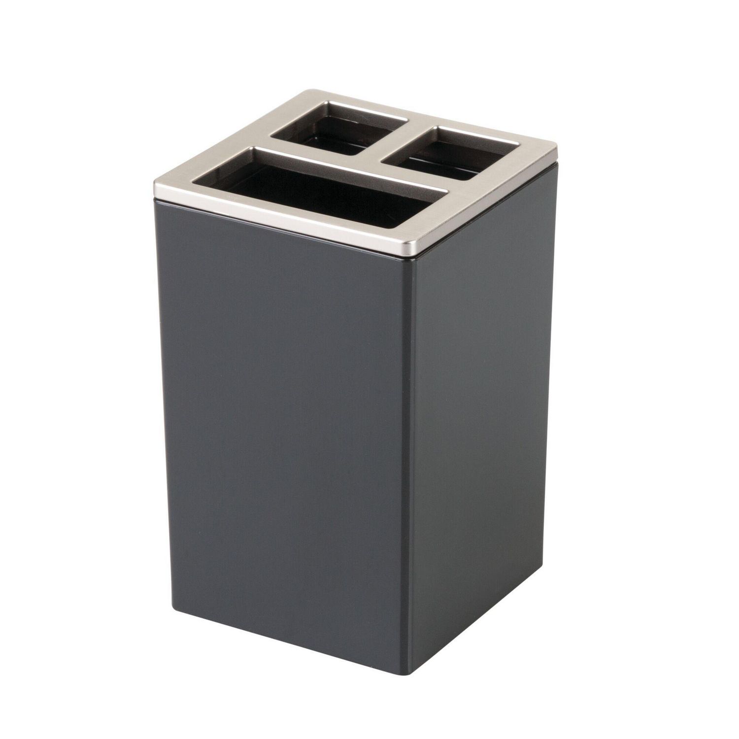 Este portacepillos de la marca Idesign, cuenta con tres divisiones para organizar tus cepillos. Sus dimensiones son de 10 cm de ancho, 6.5 cm de alto y 6.5 cm de profundidad, lo que lo hace compacto y funcional. Su acabado brillante y forma rectangular lo convierten en un accesorio atractivo y duradero.