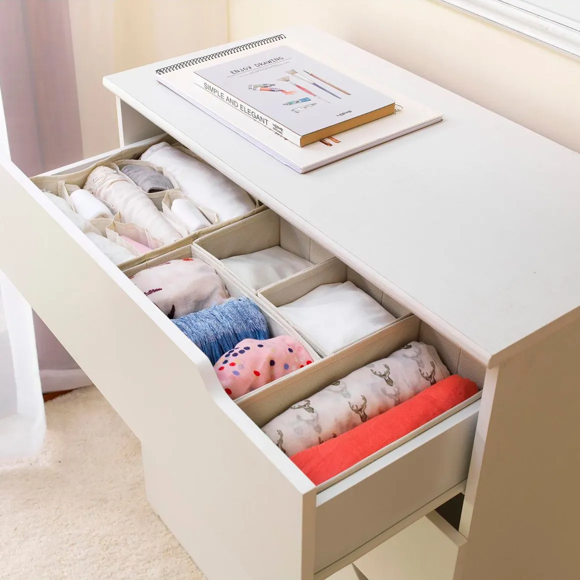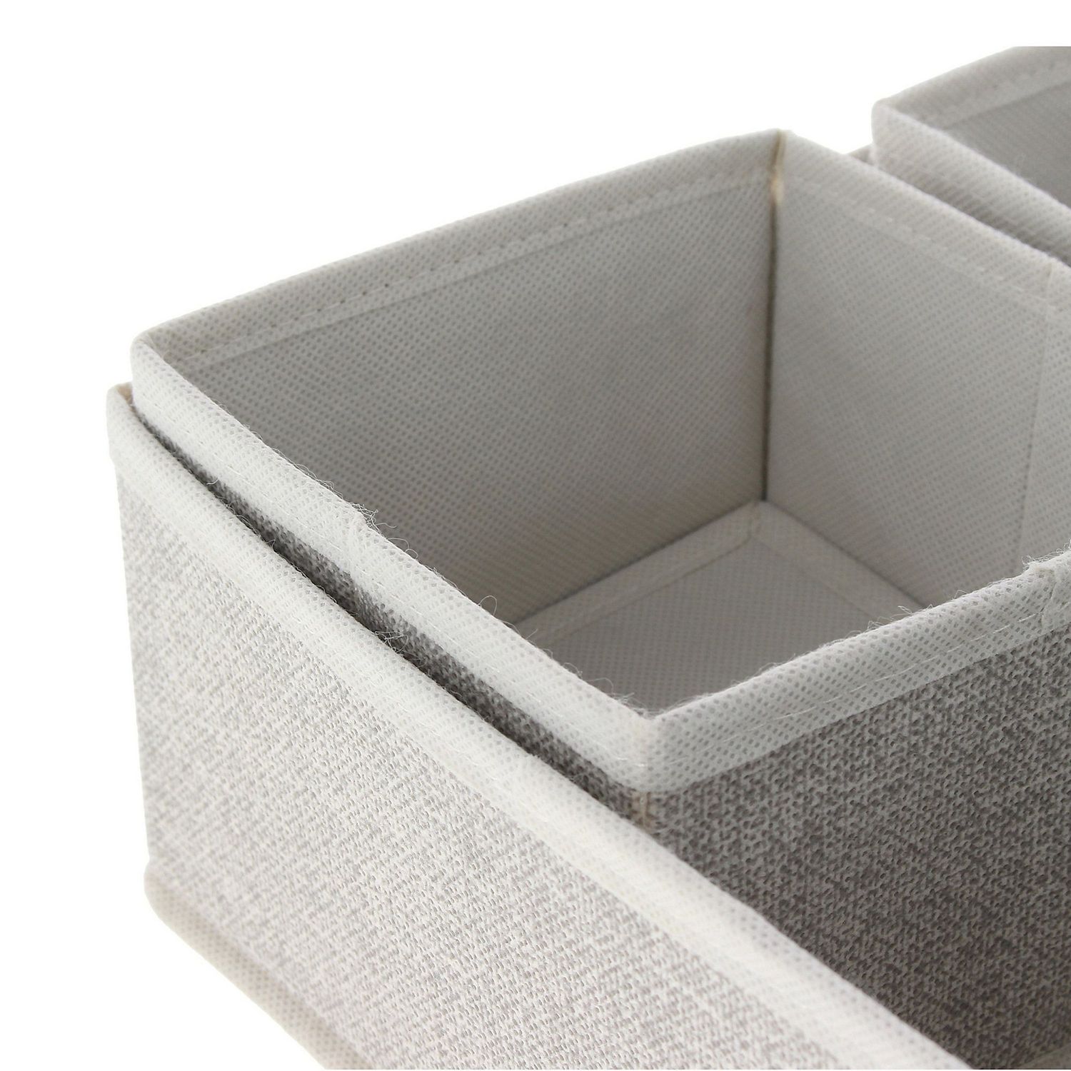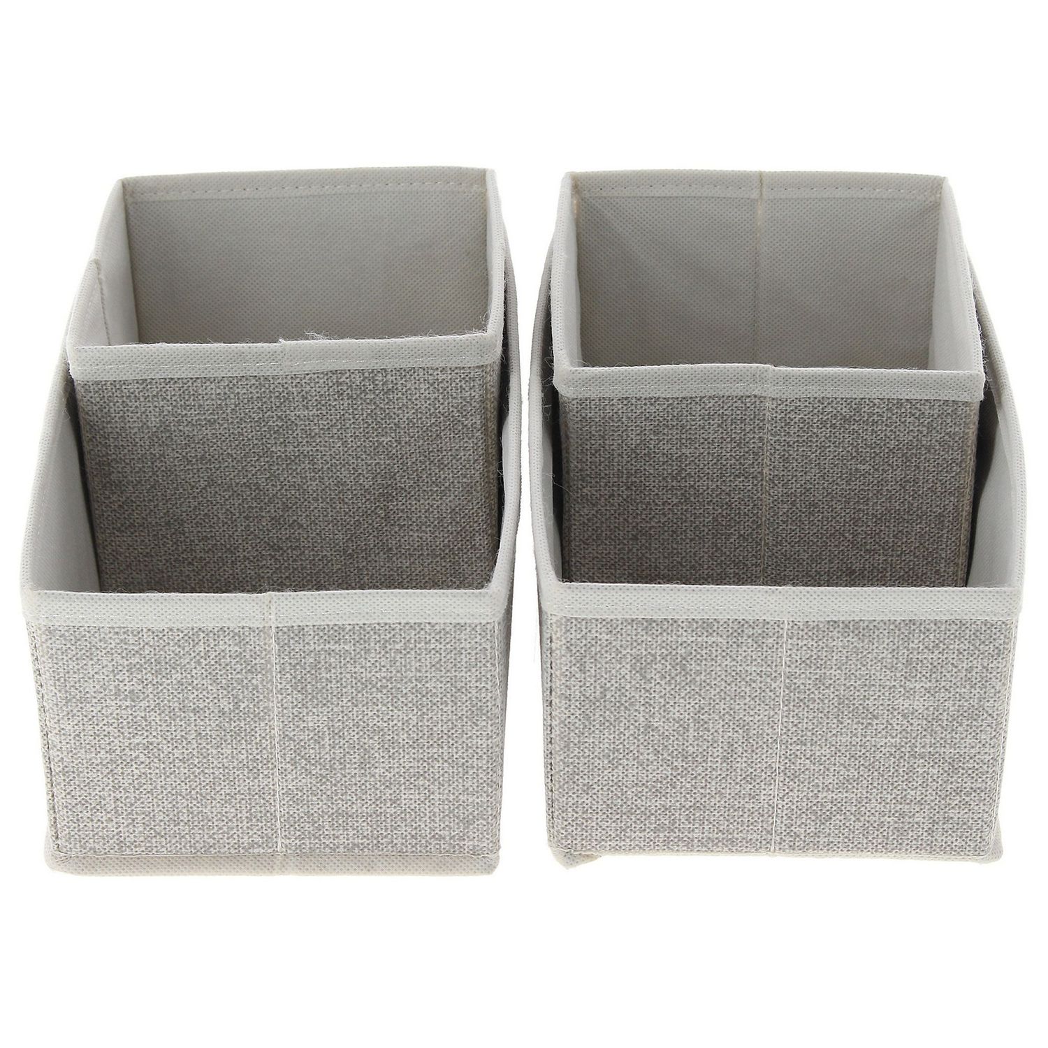 Este set de organizadores, de la marca Just Home Collection, está hecho de tela, un material no tejido que no se deshilacha. Cada caja tiene 14 cm de ancho y 14 cm de alto, con 4 compartimentos para una mejor organización. Son perfectas para usar en el dormitorio, manteniendo un estilo clásico y pulcro.