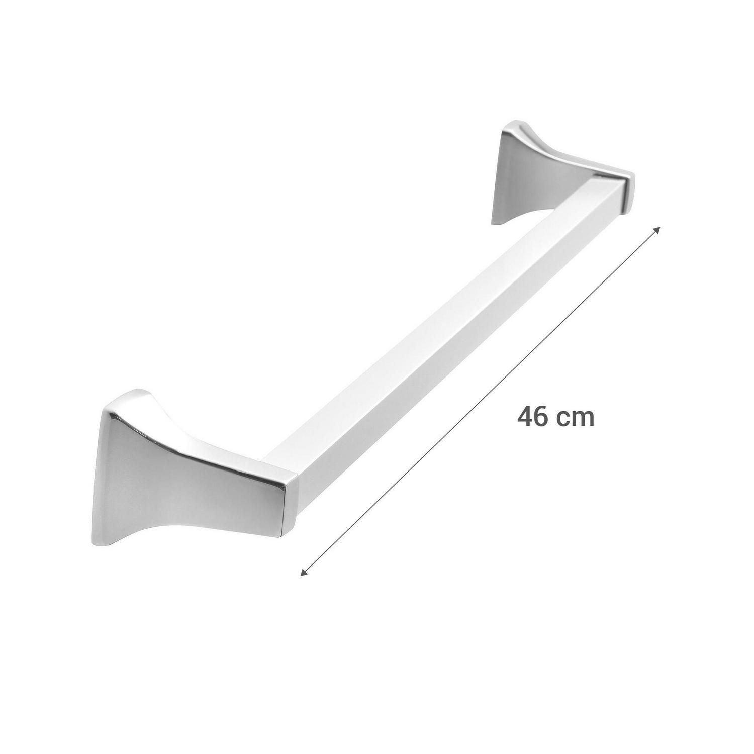 El Toallero Catania está hecho de metal de alta calidad, lo que garantiza su resistencia y durabilidad. Su acabado cromado le da un toque de brillo y elegancia, y su diseño de barra te permite colgar tus toallas de forma práctica y ordenada. El toallero tiene un ancho de 46 cm y un alto de 46 cm, lo que lo hace ideal para baños de diferentes tamaños.