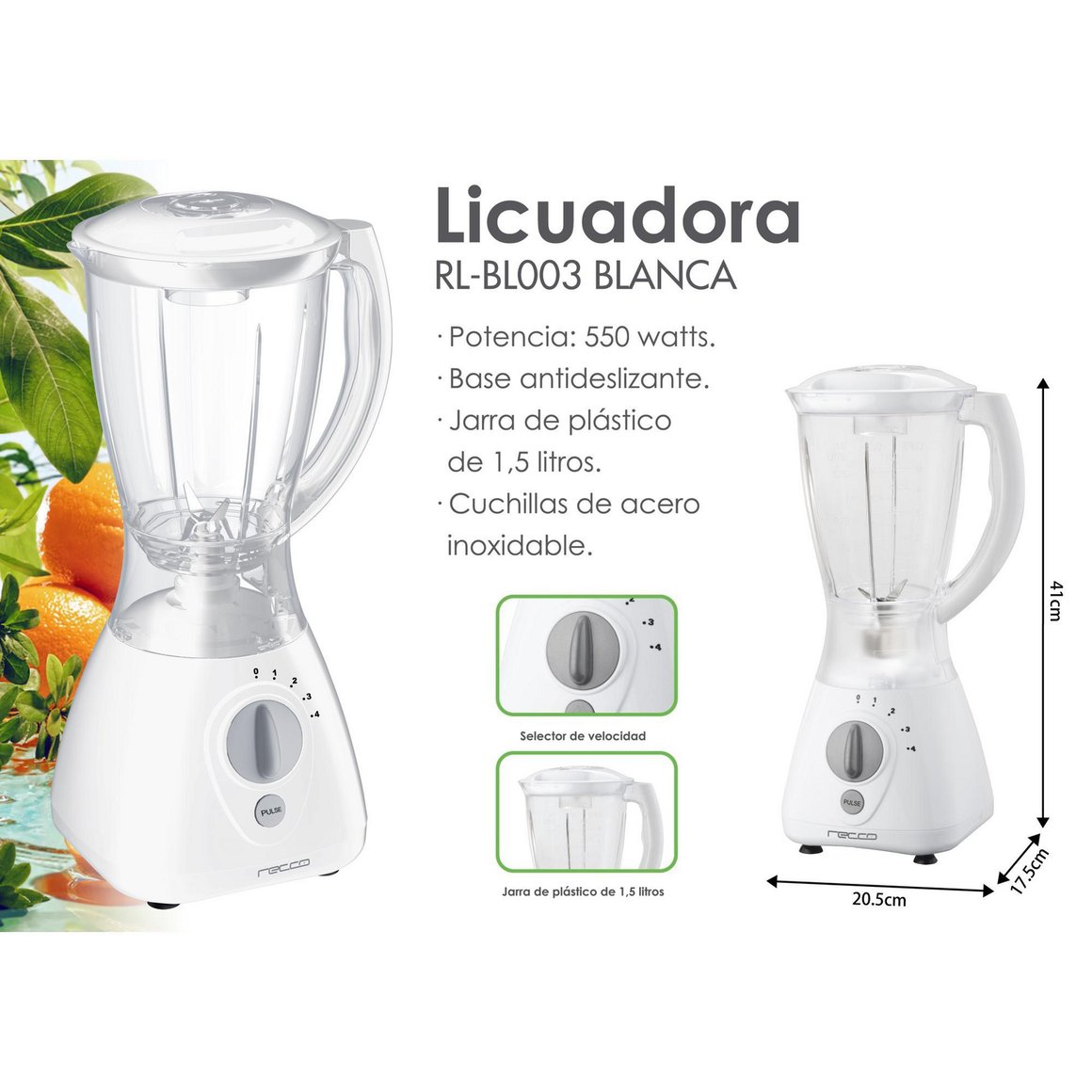 | Características | Base antideslizante. Jarra de plástico. Cuchillas de acero inoxidable. |
