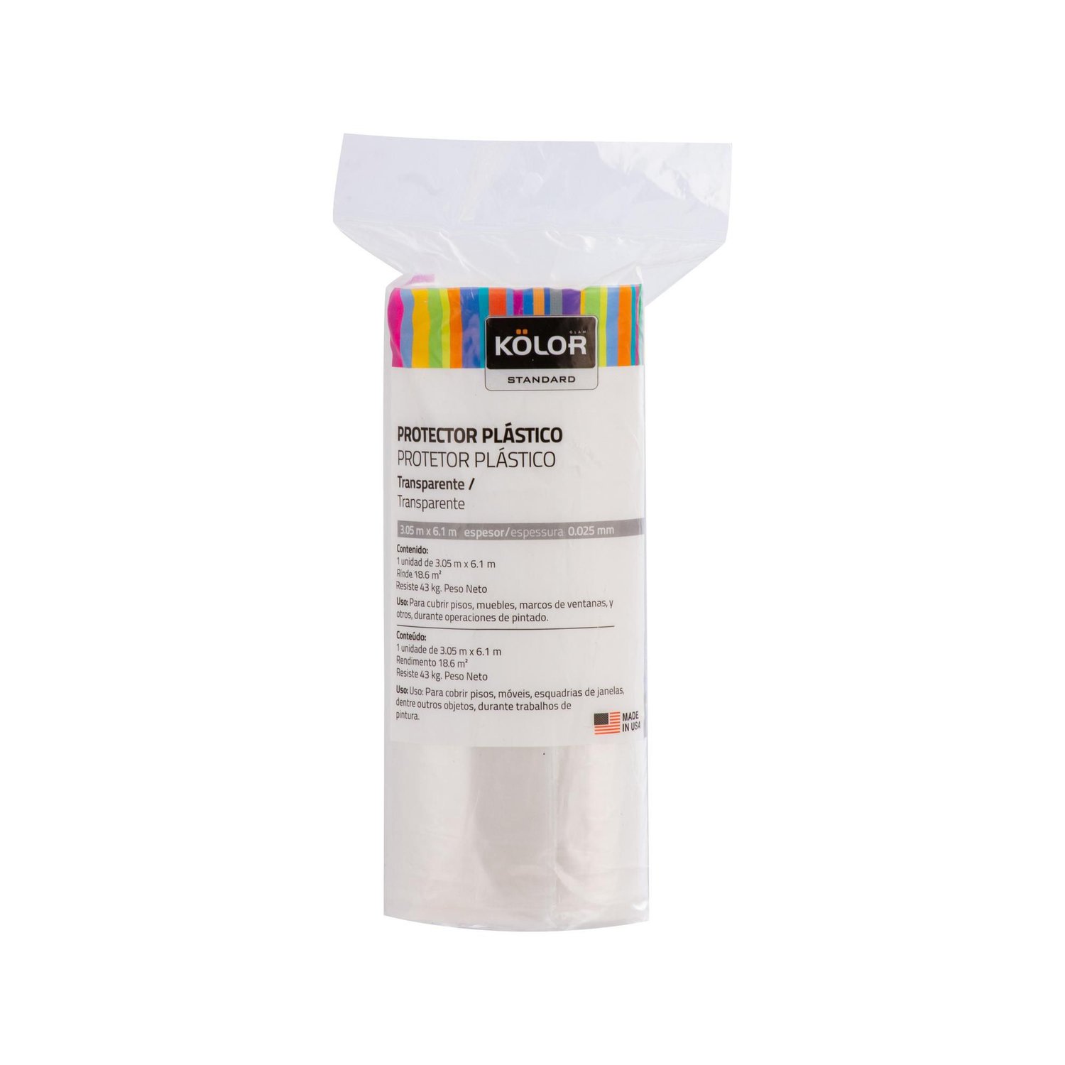 Este protector de plástico, de la marca Kolor, es perfecto para cubrir superficies. El producto empacado tiene un peso de 0.442 kg. Este producto es una excelente opción para tus proyectos.