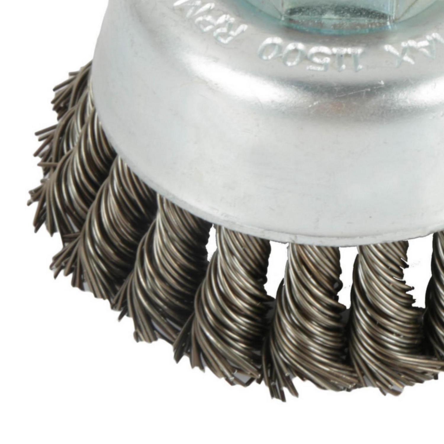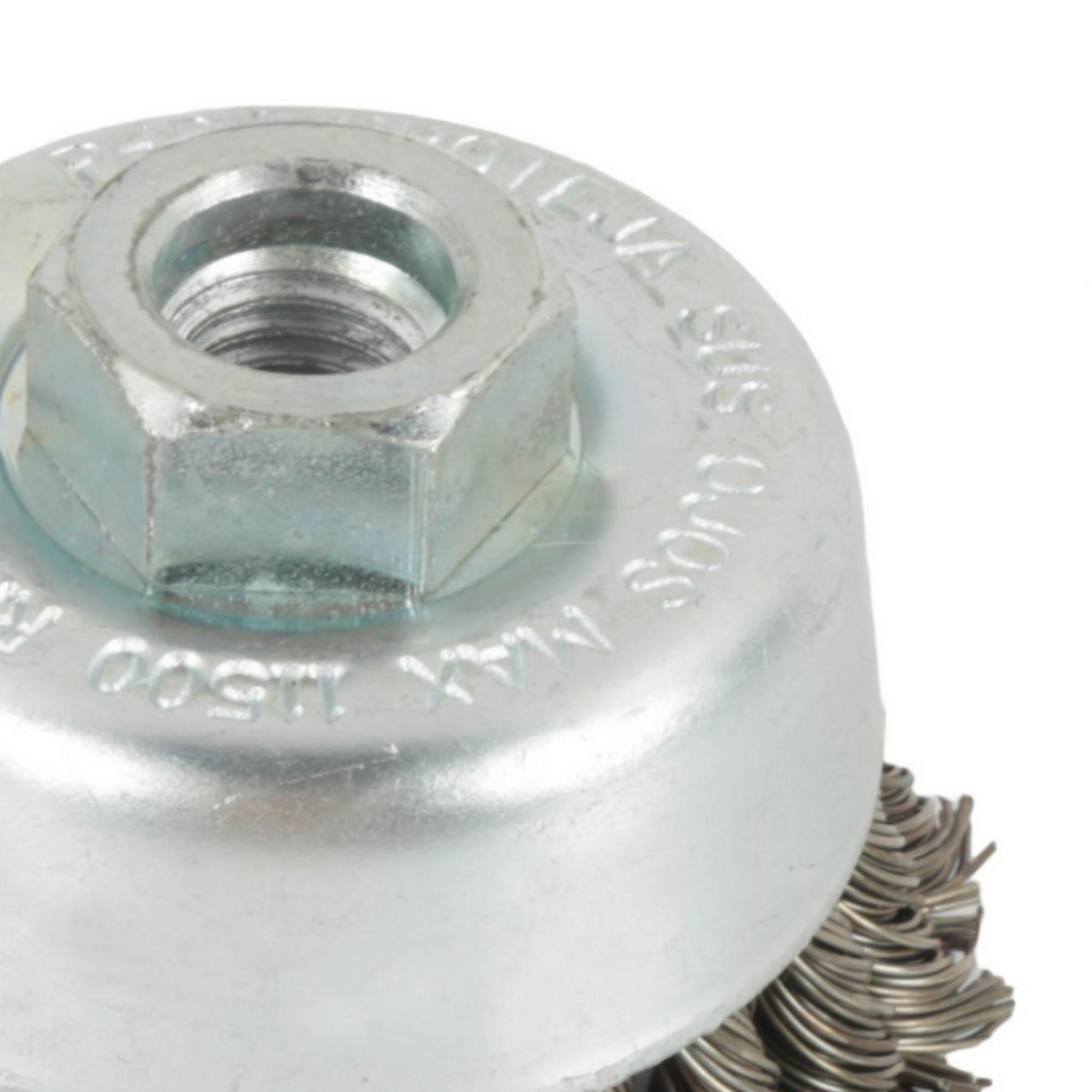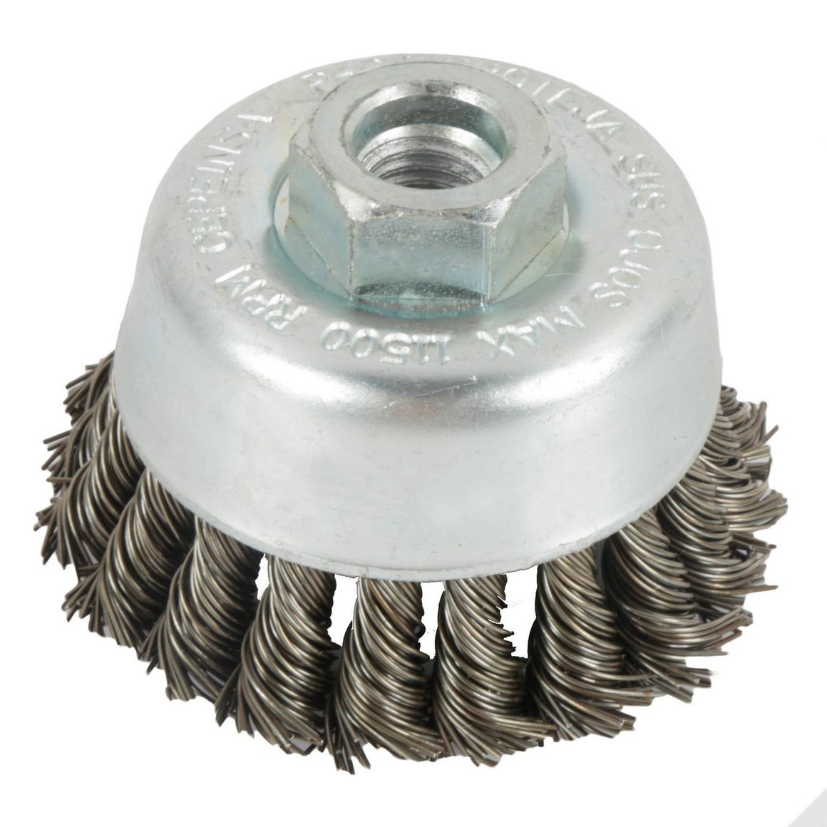 | Características | Cepillo para uso en amolador. Acoplamiento, árbol de esmeril milimétrico M14. RPM Max 11500. Materia prima: Alambre 100% alemán. Tecnología Alemania. Cepillado continuo y larga duración. |