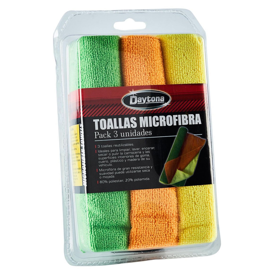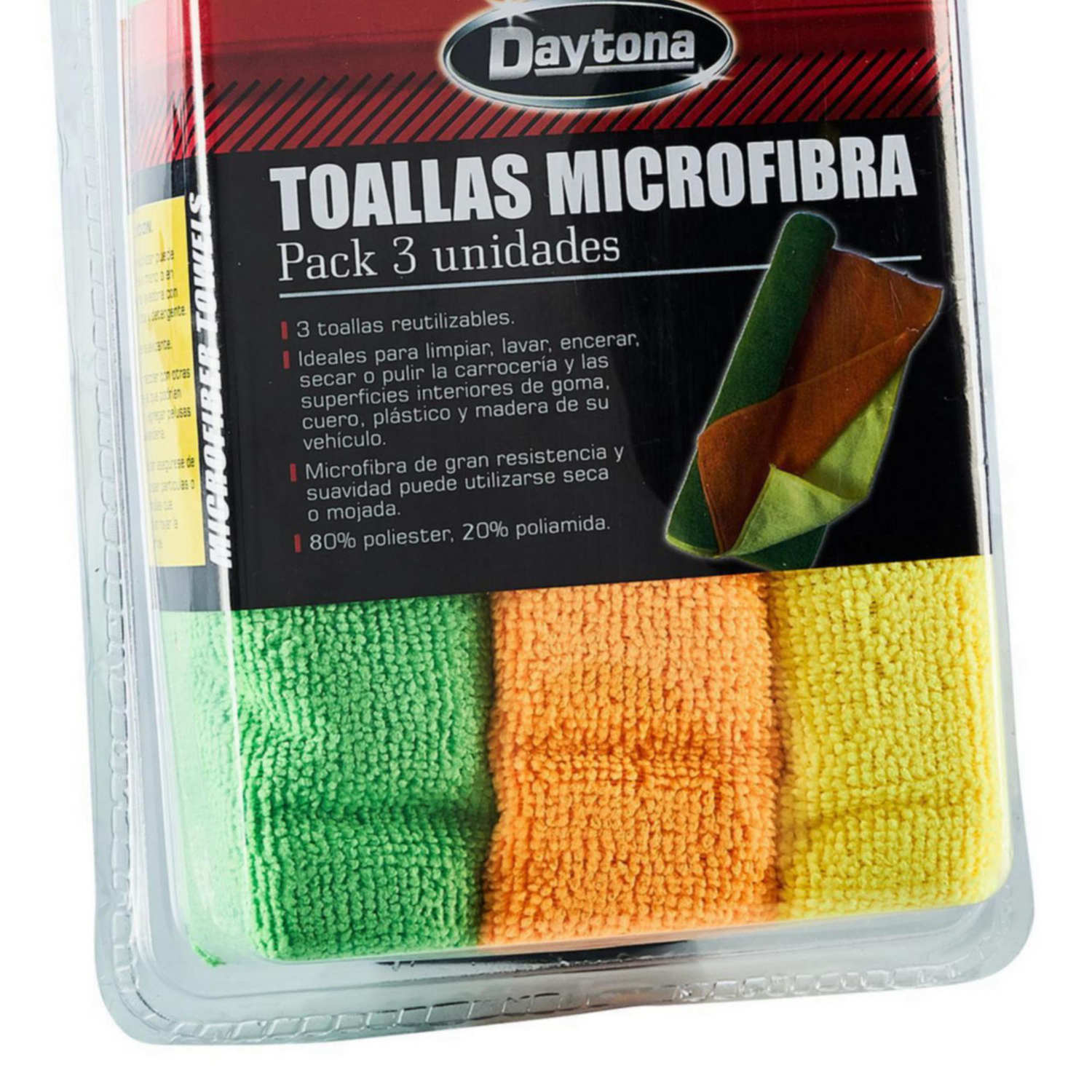 Estas Toallas de Microfibra Daytona son perfectas para el cuidado de tu auto. Están hechas de 80% poliéster y 20% poliamida, lo que les da una gran resistencia y suavidad. Puedes utilizarlas secas o mojadas para limpiar y secar tu vehículo. ¡Con 3 unidades, tendrás suficiente para mantener tu auto impecable!