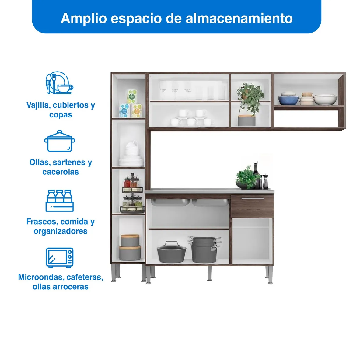 Para completar tu cocina, considera los lavaderos de cocina, ideales para mantener la limpieza y funcionalidad. También puedes explorar la grifería de cocina, que te permitirá tener un espacio más moderno y funcional. Si necesitas más espacio de almacenamiento, los roperos son una excelente opción para organizar tus utensilios y alimentos.