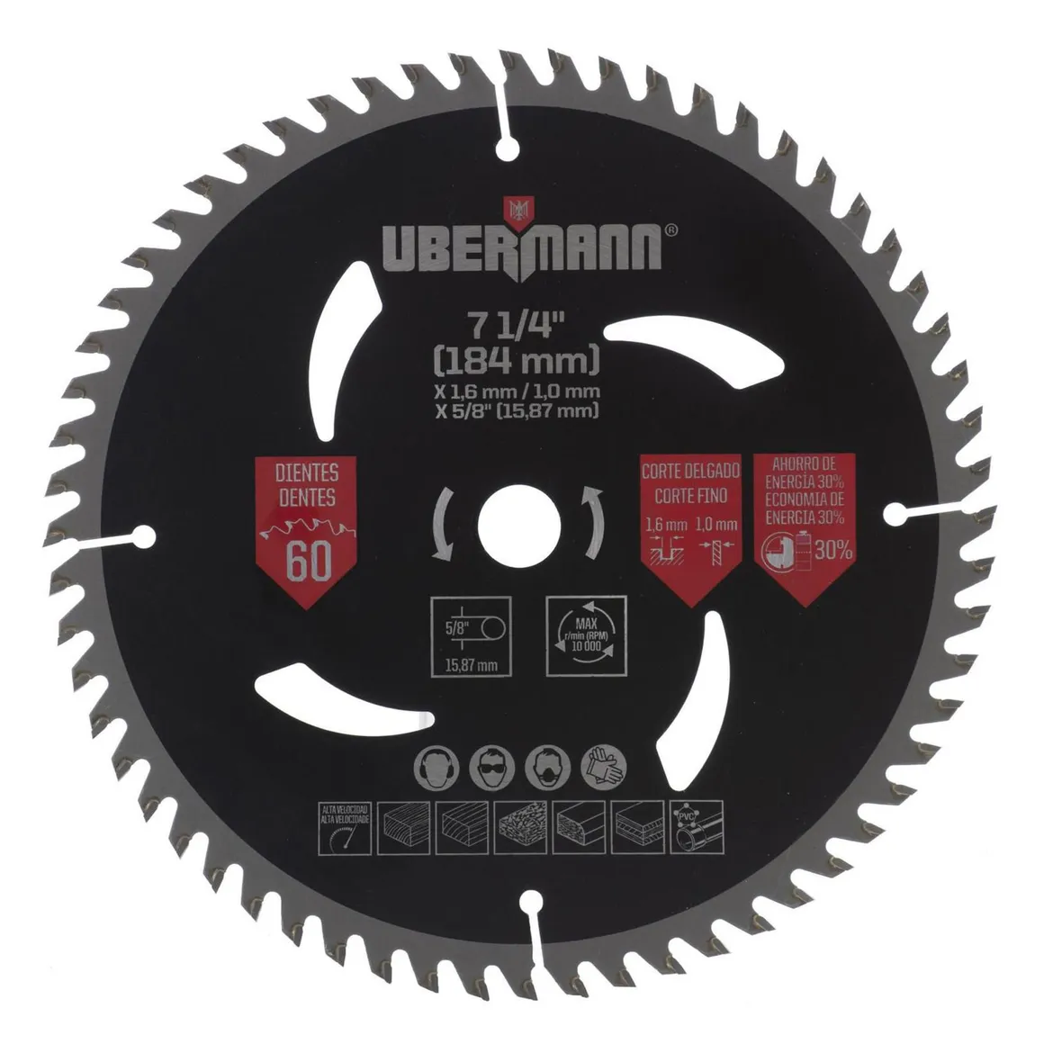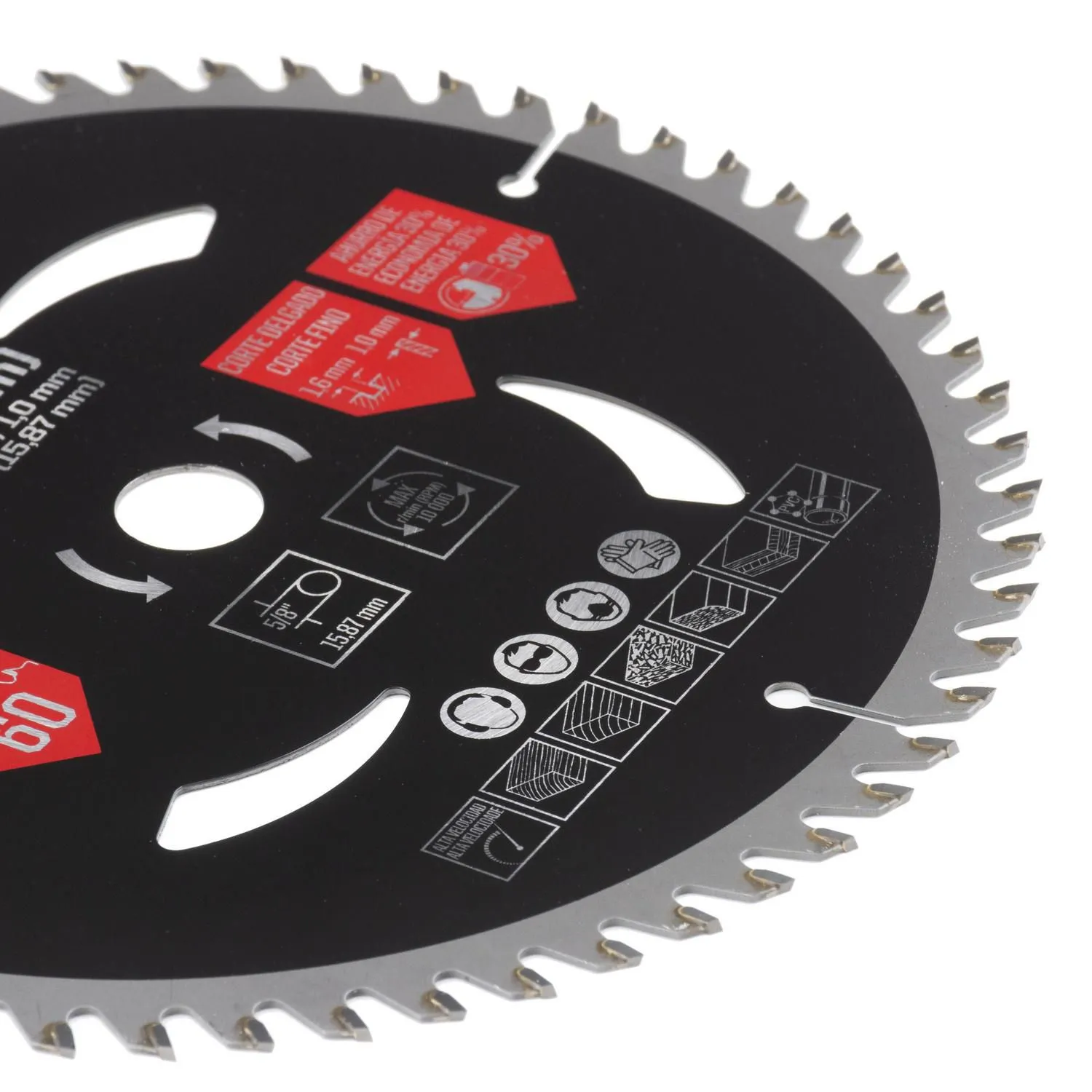| Características | Hoja de acero con pastilla de carburo tungsteno, cuerpo de 1 mm espesor y 1,6 mm de espesor de corte. Centro 5/8". Con ranura de ventilacion, corte de madera |
