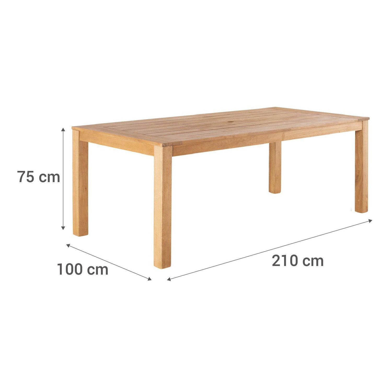 Este juego de comedor de terraza requiere armado y está fabricado con madera, ofreciendo durabilidad y un toque natural. Las dimensiones de la mesa son de 210x100x75 cm, mientras que las sillas miden 60x58,5x85 cm. El juego incluye 8 sillas y 1 mesa, ideal para compartir con familia y amigos. Cuenta con apoyabrazos para mayor comodidad.