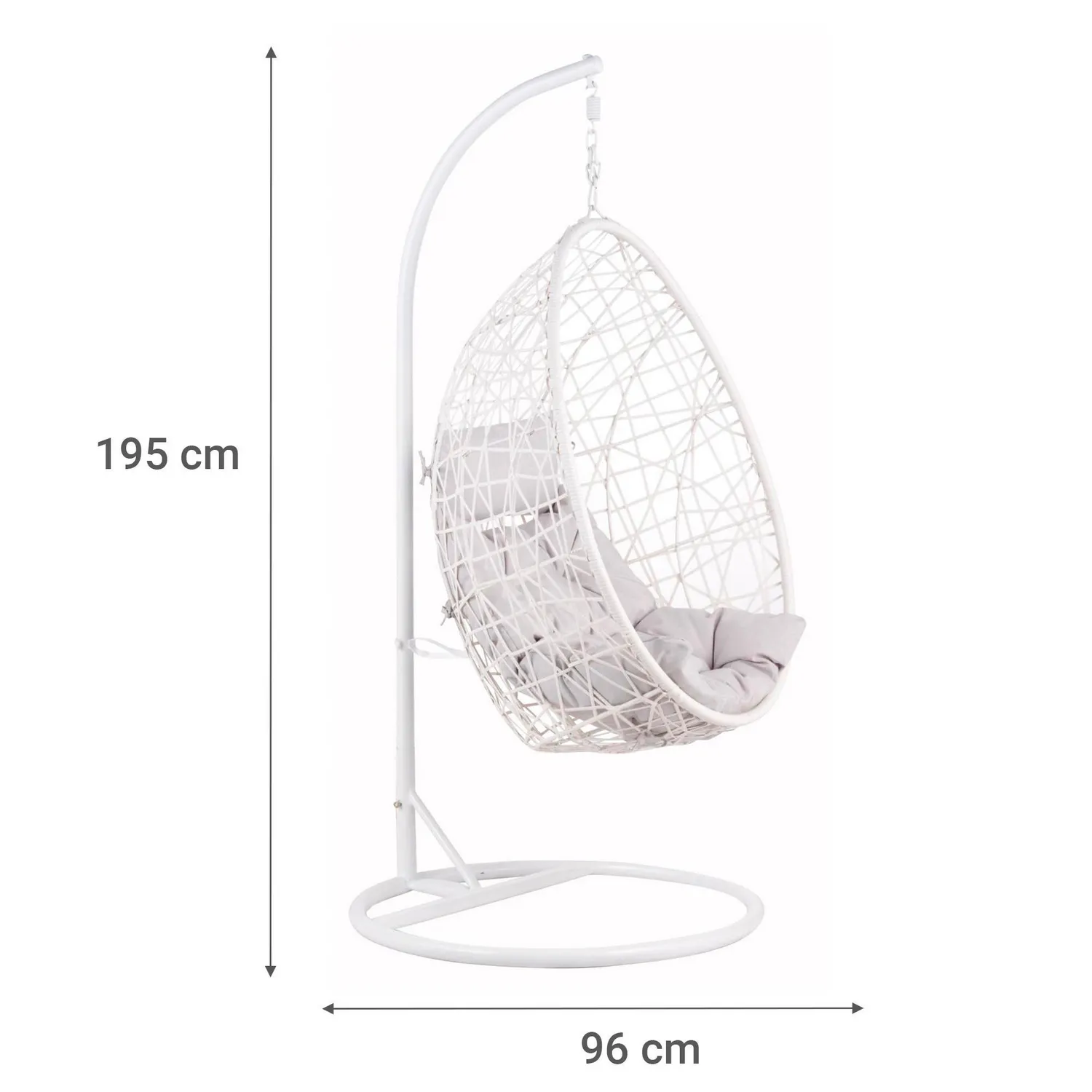 Imagina relajarte en tu hogar con la Silla Colgante Ratán Blanca con Soporte. Su diseño Egg te invita a disfrutar de tus espacios con total tranquilidad, ya sea en el interior o en el exterior, gracias a su soporte móvil. Su color blanco combina con cualquier ambiente, y su material de poliratán asegura durabilidad y fácil limpieza.