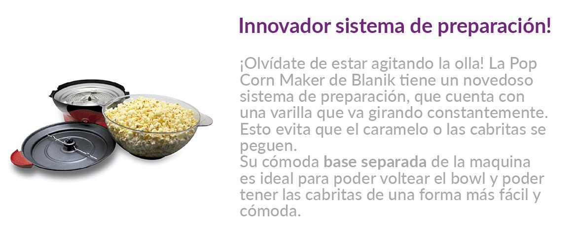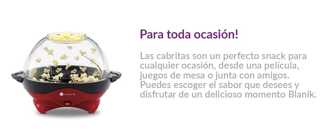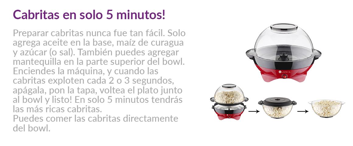 | Características | Máquina para hacer canchita popcorn muy fácilmente. Alegra tus tardes de películas y ocio preparando popcorn en solo 5 minutos. Prepara popcorn y sirve en tu misma máquina para hacer canchita. |
