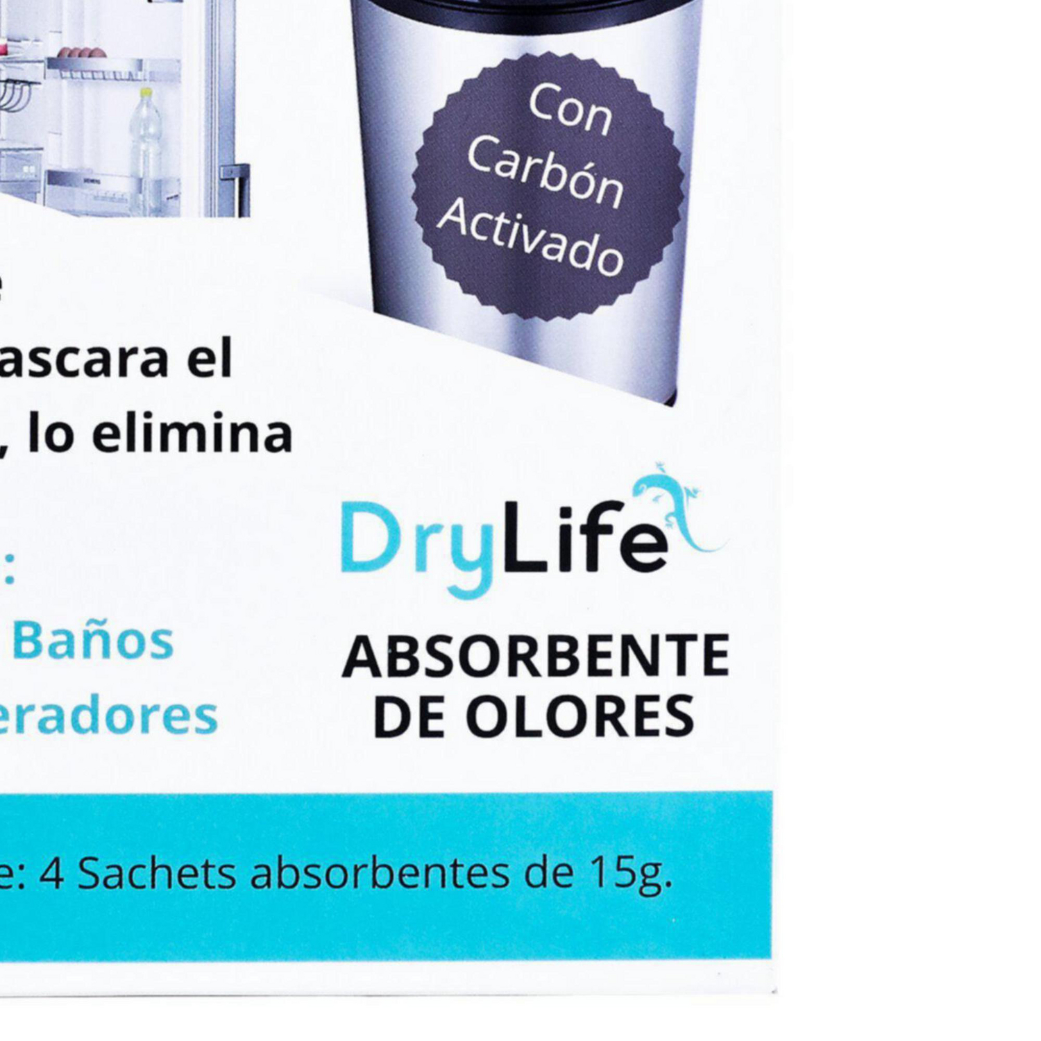 El Absorbente de Olores Drylife está hecho de carbón activado, un material natural que absorbe los olores sin enmascararlos. Cada unidad tiene un área de cobertura de 1 m2 y es de color gris. Es rectangular y tiene un ancho de 10.2 cm, un alto de 7 cm y una profundidad de 0.5 cm. El producto es de uso doméstico y pesa 0.104 kg.