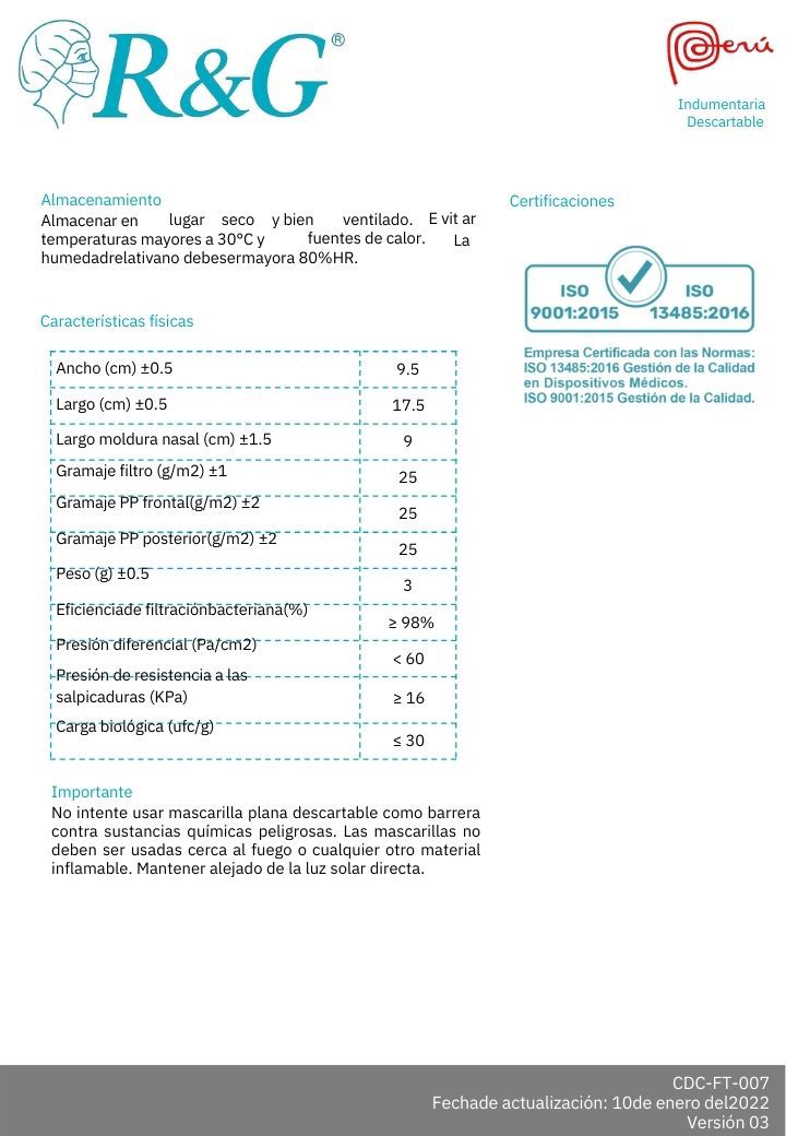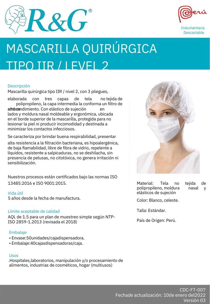 | Características | Mascarilla plana descartable tipo IIR, nivel 2 |