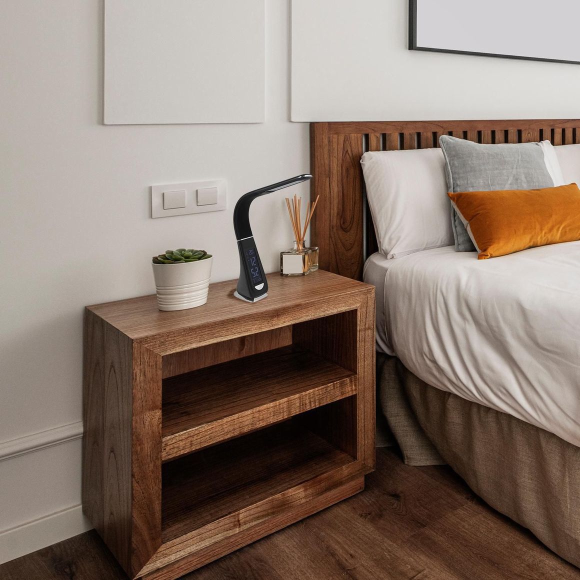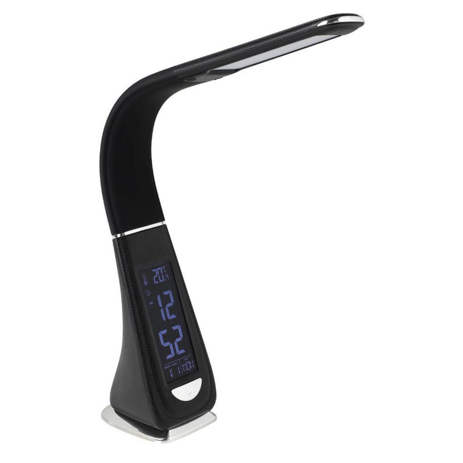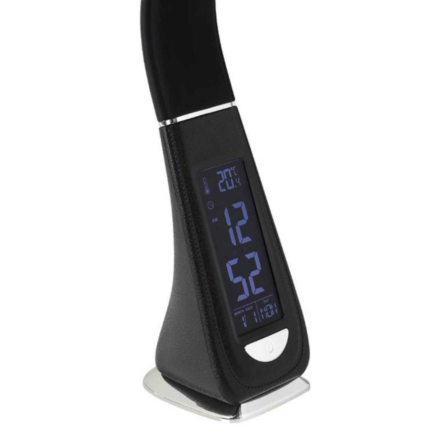 Esta lámpara de mesa cuenta con un LED integrado que emite una luz blanca neutra, ideal para trabajar. Sus dimensiones son de 7 cm de largo, 10 cm de ancho y 51 cm de alto. Además, incluye funciones de reloj, temperatura y fecha, así como una función de despertador con diferentes sonidos. Fabricada en plástico, esta lámpara es una adición práctica y decorativa para tu escritorio.