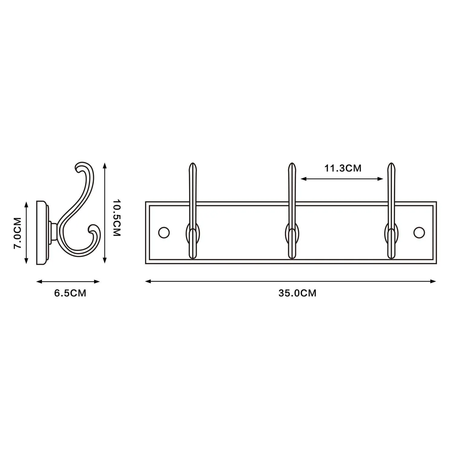 Este perchero de pared, con sus 3 ganchos, está fabricado en madera, lo que asegura su durabilidad. Sus dimensiones son de 35 cm de ancho y 10.5 cm de alto, con una profundidad de 6.5 cm, lo que lo hace compacto y fácil de instalar. Soporta un peso máximo de 3.5 kg, ideal para tus prendas y accesorios. Su estilo vintage moderno lo convierte en un elemento decorativo funcional.