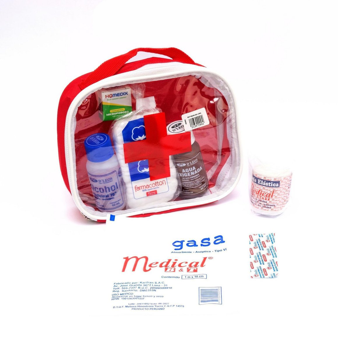 | Características | Contenido: Alcohol, algodón, agua oxigenada, curitas, esparadrapo, vendas y gasas, Uso: Ideal para vehículos. |